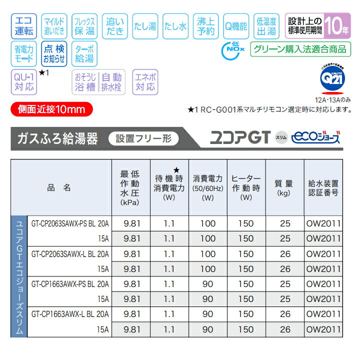 ●号数:20号 ●シンプル(オート)スリム ●側面近接10mm ●PRO-TECメカ 水量サーボ ●給水・給湯接続:R3/4(20A) ●給湯:36.7kW(31600kcal/h) ●ふろ:14.0kW(12000kcal/h) ●同時:36.7kW(31600kcal/h) ●ガス種:都市ガス(12A13A) ◆商品型番 ・ノーリツ ・GT-CP2063SAWX-PS BL 商品画像はイメージです。品番でのご注文となりますので、仕様やお色味などは事前にメーカーへご確認下さい。◆メーカー問合せ先 【ノーリツ0120-911-026】
