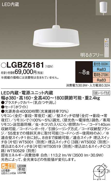 【LGBZ6181】パナソニック LEDペンダント 引掛シーリング方式 〜8畳用 ホワイト 昼光色〜電球色(6500K〜2700K) 【panasonic】
