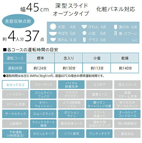 【セット内容】 ・本体 【ドアパネル型について】 ドアパネル型の商品は化粧パネルなしの素地でもご使用頂けます。 化粧パネル無しでご使用いただくか、別売の化粧パネルなどをご用意ください。 ※イメージ画像は別売パネルをセットしている場合がございます。 また、形状によっては既設の化粧パネルを転用できない場合もあります。 システムキッチンの化粧パネル(別売品)との組み合せなどご不明な点は、お気軽にご相談下さい。 【規格・特徴】 ・標準使用水量:9L(標準コース) ・1回あたり標準運転経費:30.8円 ・洗えるまな板寸法(mm):縦220×横400×厚さ15 ・食器収納点数:約4人用(37点) ・運転コース:標準、念入り、少量、予約、乾燥 ・外形寸法(mm):高さ548×幅448×奥行626 ・質量(kg):約21.5 ・使用電源:AC100V 50/60Hz共用 ・給水方式:給水・給湯兼用(給湯は70度以下) ・洗浄方式:回転ノズル噴射による加熱洗浄方式 ・乾燥方式:ヒーター間欠通電+強制送風 ・温度制御方式:サーミスタによる制御 ・水位検知:水位スイッチによるマイコン制御 ・給排水ホースの長さ(mm):給水950/排水975 ・運転音:標準コース38dB(50/60Hz) ・庫内容積(リットル):63 【本体カラー】 ・シルバー 【機能】 ・おかってかご ・バイタル除菌洗浄 ・スリムラインフェイス ・タワーウォッシャー ・銀イオンカートリッジ付属 ・サークルラック ・スムーズラック ・ポジションサイン ・オールトップコントロール ・クイックスタート機能 ・予約運転(4時間固定) ・からっとキープ ・ソフト排気 ・ワンタッチドア ・化粧パネル対応 【商品説明】 シンプルな機能を備えたスタンダード深型スライドオープン。 いろいろな形の食器が入れやすい、おかってカゴタイプ。 【大型商品の配送について】 ■基本ドライバー1人で訪問の為、荷下ろしの際にお手伝いできる方が必要となります。 ■時間指定が出来かねます。 詳細の配送状況につきましては、直接運送会社へご確認お願い申し上げます。 不在時は、不在票が投函されますので、お客様にて再配達のお手続きをお願い申し上げます。 食器洗 食洗機 節水 除菌洗浄 2019年8月 食器洗い乾燥機 食器洗乾燥機 ディープリンナイRSW-D401AE-SV