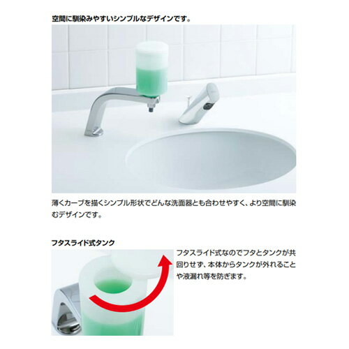 【規格・特徴】 ・液状(350mL) ・吐水口長さ93mm ・壁付 【商品説明】 シンプルデザイン&お手入れラクラクの水石けん入れ。 【注意】 タンクフタスライド回転軸中心位置は製品によって異なります。 指定以外の水石けん液をご使用されますと器具に悪影響を及ぼすことがあります。 ※3連まで連結可能です。詳しくはお問い合わせ下さい。 リクシル 水石けん入れ 水石けん供給栓 2021年7月LIXILKF-24G