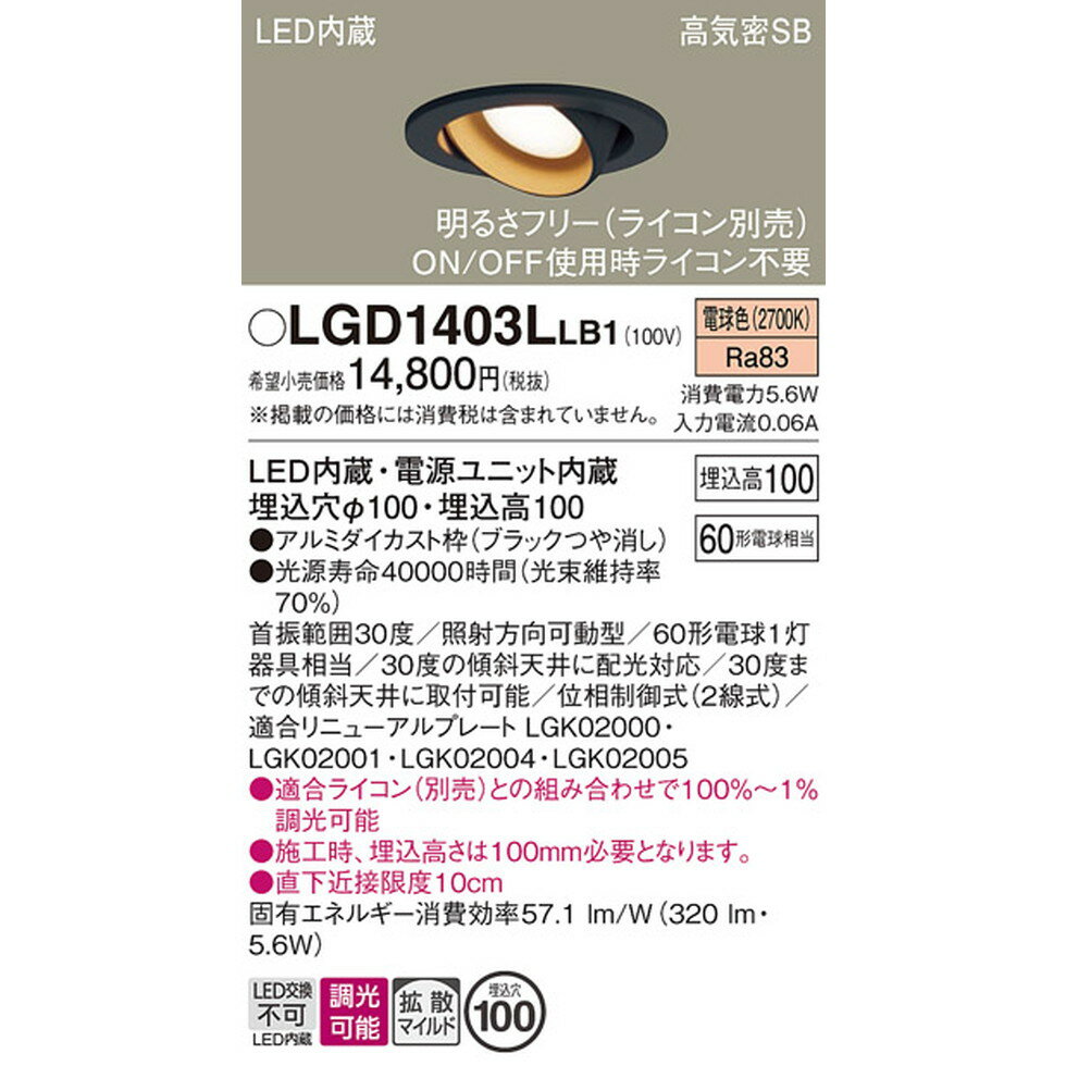 パナソニック[LGD1403LLB1]天井埋込型 LED(電球色) ユニバーサルダウンライト 浅型10H・高気密SB形・拡散タイプ(マイルド配光) 調光タイプ(ライコン
