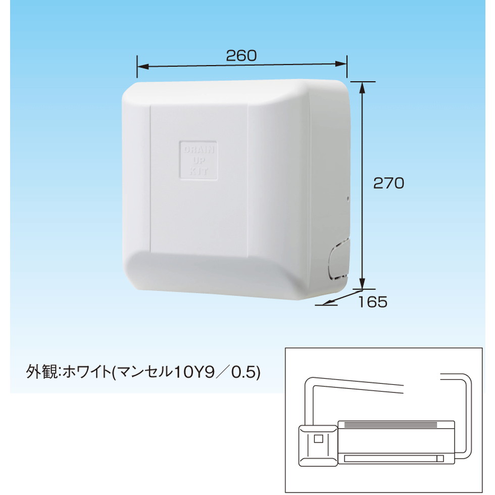 低揚程用ドレンアップキット壁掛型 ホワイト 最大揚程:1m※ドレンアップキット底面より ドレン排出流量:24l/h 電源:100V、50/60Hz 消費電力:13.5/12.3(W) 運転電流:0.3/0.25(A) 絶縁:E種 ドレン管径:入口VP13、出口VP20※付属部材にて接続 安全装置:フロートスイッチ 運転音:25dB 重量:3.2kg
