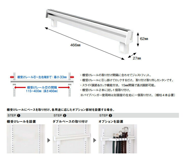 ●メーカー取り寄せ商品● メーカー在庫なしの場合、お日にちがかかる場合がございます。 ============================= ●棚受けレールの取り付け間隔に合わせてジャストフィット。 ●棚受けレールに引っ掛けてロックするだけ。取り付け取り外しカンタンです。 ●スライド調節&ロック機能付き。15mm感覚で高さ調節可能。 ●棚受けレール2本に対し1個取り付け。 ※パイプハンガー使用時は対面壁の左右に1個取り付け。(棚柱4本必要) 【サイズ】 幅466×高さ62×奥行27mm 【耐荷重】 25kg DIY / 収納