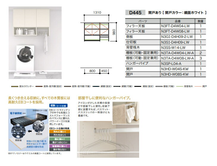 南海プライウッド ラクエル 4.5尺洗濯機上プラン 高さ980mm 奥行445mm 開戸あり 鏡面ホワイト AE014441LWKW