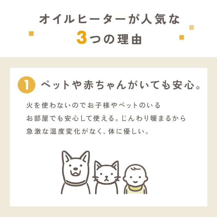 ※注文確定時に時間指定のプルダウンが出てくる場合がございますが、設置込み商品ご注文の場合は時間指定できかねますので、予めご了承ください。 お届け先が沖縄・離島の場合、お届け日時のご希望に沿えない場合がございます。予めご了承ください。 ■商品サイズ(cm)幅約25×奥行約47.5×高さ約65■商品重量約10.5kg■材質スチール、ABS■電源コード長1.36m■電源AC100V、50・60Hz■消費電力強:1200W中:700W弱:500W■適用床面積和室:5畳洋室:8畳火を使わないからクリーンな空気で安全&安心!◇部屋全体をムラなく暖め、温風や炎を出さないので空気を汚さない。◇キャスター付きだから移動も楽々♪◇ヒーターの切替が強・中・弱の3段階できます。◇温度調節は高温から低温まで調節できます。[検索用:ヒーター オイルヒーター 1200W 8畳用枚フィンオイルヒーター 温度調節枚フィン スリム 薄型 省スペース コンパクト キャスター付き アイリスオーヤマ 4967576331104] 最強翌日配送対象商品に関するご案内 最強翌日配送対象商品・対象地域に該当する場合は最強翌日配送マークがご注文カゴ近くに表示されます。 最強翌日配送可能なお支払方法は【クレジットカード、代金引換、全額ポイント支払い】のみとなります。 下記の場合は最強翌日配送対象外となります。 15点以上ご購入いただいた場合、 時間指定がある場合、 ご注文時備考欄にご記入がある場合、 決済処理にお時間を頂戴する場合、 郵便番号や住所に誤りがある場合、 最強翌日配送対象外の商品とご一緒にご注文いただいた場合、 お届け先住所文字数が40文字以上の場合 関連キーワード(本商品の説明ではありません)母の日 父の日 敬老の日 こどもの日 クリスマス バレンタイン ホワイトデー ハロウィン お正月 成人の日 成人式 記念日 誕生日 卒業式 入学式 お歳暮 お中元 春 夏 秋 冬 梅雨 節分 ひな祭り 七夕 十五夜 初詣 年越し 夏祭り 花火大会 結婚祝い 内祝い 出産祝い 快気祝い 還暦祝い 古希 喜寿 傘寿 米寿 卒寿 白寿 百寿 新築祝い 引っ越し祝い 開店祝い 開業祝い 就職祝い 昇進祝い 合格祝い 銀婚式 金婚式 七五三 長寿祝い 御礼 お母さん お父さん 義母 義父 祖父 祖母 おばあちゃん おじいちゃん 娘 息子 彼氏 彼女 恋人 友達 上司 先輩 後輩 同僚 キッズ 子供 幼児 ベビー 赤ちゃん 育児 学生 社会人 シニア 10代 20代 30代 40代 50代 60代 70代 80代 90代 一人暮らし 単身赴任 主婦 主夫 新生活 家族暮らし 子育て 旅行 トラベル ライブ ホームパーティ ビジネス 法人 ギフト プレゼント