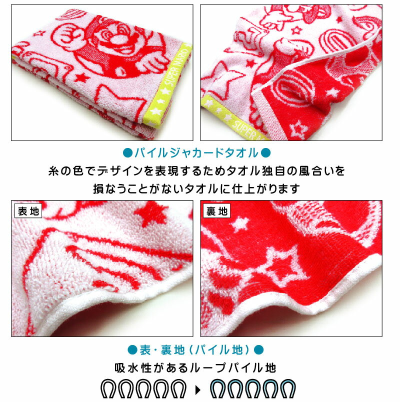 ●商品説明 キャラクター フェイスタオル ・キャラクター: 任天堂 スーパーマリオ ルイージ スーパーキノコ スーパースター はてなブロック ファイヤーフラワー コイン ・サイズ:約34×80cm ・素材 綿100% ●備考 レジャーでは、海やプールで活躍しお風呂上りの際やジョギングなどの汗拭きタオルとしてもご使用頂いている子供から大人まで大人気の商品です! ■ふわふわ「無撚糸」をつかったタオル 綿の繊維をほとんど撚らずに作られた糸の事で肌に触れた時、綿本来のふっくらとした柔らかさを感じることができます。 ■ジャガードタオル 糸の色でデザインを表現するためタオル独自の風合いを損なうことがないタオルに仕上がります。 ■綿100% 肌に優しい綿100%のため、通気性・吸湿性が良くやわらかな肌触りです。 ■表・裏地(パイル地) 吸水性があるループパイル地です。 ■抗菌防臭加工 嫌な臭いを防ぎ繊維上の細菌の増殖を制御します。 ●配送方法 ・宅配便 ・メール便(メール便B) ・ご利用頂くシーン(季節のイベント) 1月 お年玉 お年賀 成人の日 2月 バレンタインデー 3月 ホワイトデー 卒業 卒団 卒園 卒部 春休み 4月 入園 入学 進級 新生活 入社祝い 5月 ゴールデンウィーク こどもの日 母の日 6月 父の日 7月 七夕 お中元 御中元 暑中見舞い 8月 夏休み お盆 盆玉 帰郷 帰省 9月 敬老の日 シルバーウィーク 10月 孫の日 運動会 体育祭 学園祭 文化祭 お遊戯会 ブライダル ハロウィン 11月 勤労感謝の日 12月 クリスマス 大晦日 冬休み お歳暮 御歳暮 ・贈り物(プレゼント)・お祝い 誕生日 入園祝い 入学祝い 卒業祝い 記念品 参加賞 お見舞い 退院祝い 全快祝い 快気祝い ご挨拶 引越し 引っ越し 新築祝い