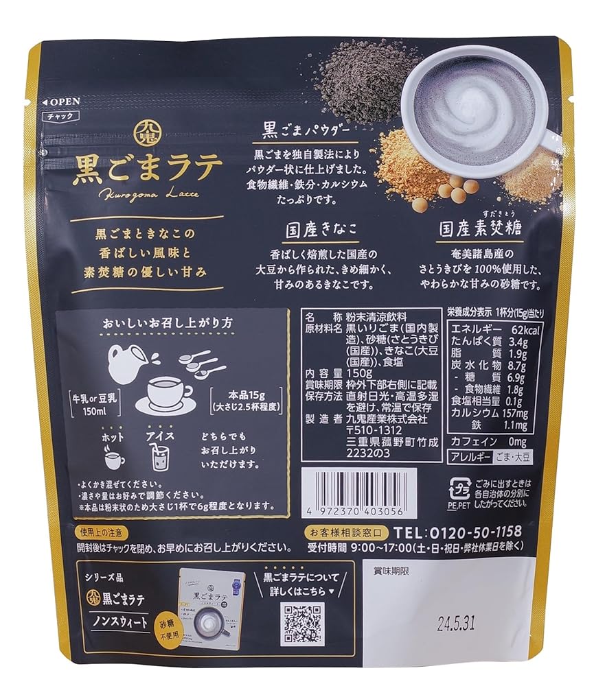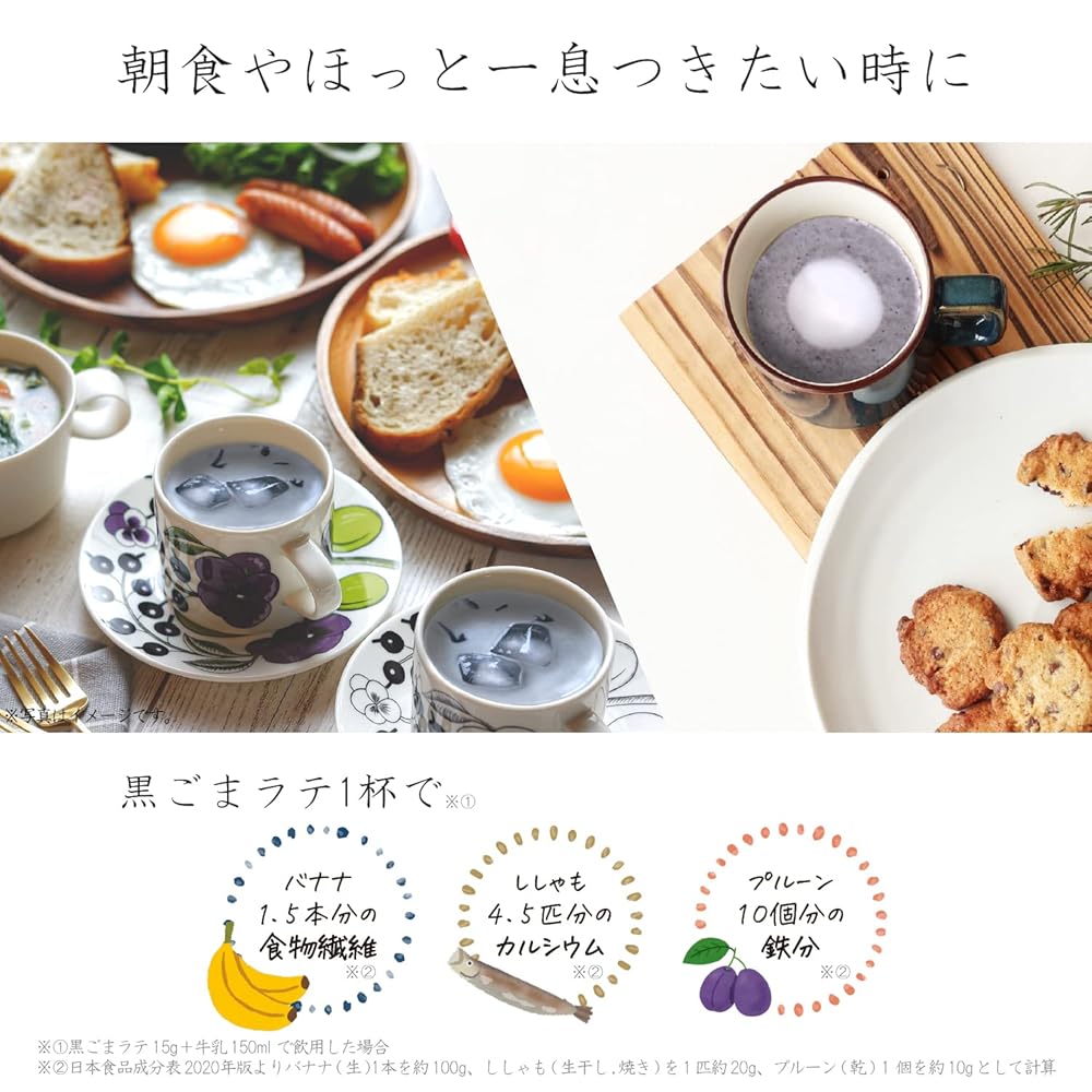 商品情報 商品の説明 商品紹介1杯(15g)に黒ごま約6000粒使用。 黒ごまときなこの香ばしい風味と素焚糖の優しい甘みの黒ごまラテ。 食物繊維・カルシウム・鉄分たっぷりの「黒ごま」、国産の大豆から作られたきめ細かく甘みのある「国産きなこ」、奄美諸島産のさとうきび100%使用した「国産素焚糖」を使用。 人工甘味料、香料は使用していません。 不足しがちな食物繊維、カルシウム、鉄分の栄養素をおいしく補給できます。 ほっと一息つきたい時の一杯に。 プリンやロールケーキ等の製菓にもお使い頂けます。1杯分(15g)当たり たんぱく質3.3g 脂質1.8g 炭水化物8.8g(糖質6.9g・食物繊維1.9g) 食塩相当量0.1g カルシウム165mg 鉄1.3mg原材料・成分いり黒ごま、砂糖、きなこ、食塩使用方法おおさじ山盛り2杯(約15g)に牛乳または豆乳を150ml加え、よくかき混ぜたらできあがり。 ホット・アイスのどちらでもお召し上がり頂けます。ご注意(免責)>必ずお読みください開封後はチャックを閉め、お早めにお召しあがりください。 主な仕様 原材料:いり黒ごま、砂糖、きなこ、食塩 内容量:150g カロリー:61kcal 商品サイズ(高さx奥行x幅):18cm×18cm×15.5cm 原産国:日本