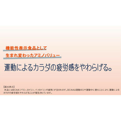 運動によるカラダの疲労感をやわらげる。食生活は、主食、主菜、副菜を基本に、食事のバランスを。届出表示本品にはBCAA(バリン、ロイシン、イソロイシンの総称)が含まれます。BCAAは運動まえや運動中に飲むことにより、運動によるカラダの疲労感をやわらげることが報告されています。1日摂取目安量2本(1,000ml)機能性関与成分BCAA(バリン、ロイシン、イソロイシンの総称)8,000mg(バリン 2,000mg、 ロイシン 4,000mg、 イソロイシン 2,000mg)届出番号B184本品は、事業者の責任において特定の保健の目的が期待できる旨を表示するものとして、消費者庁長官に 届出されたものです。ただし、特定保健用食品と異なり、消費者庁長官による個別審査を受けたものではありません。 すべてのBCAA表記は、バリン、ロイシン、イソロイシンの総称として使われています。