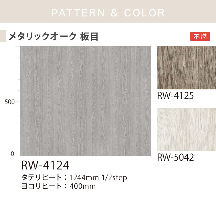 実際の商品はこちらリアテック メタリックウッドRW-4124 メタリックオーク板目 他 全8色 122cm巾 ページの上へモバイルページ品番RW-4124 RW-4125 RW-5042防火認定1-4施工上のご注意シリーズ別の注意事項ページ内の【メタリック/反射エンボス商品(A)】【低温時割れ注意(R)】をお読みください 品番RW-4128 RW-4131防火認定1-4施工上のご注意シリーズ別の注意事項ページ内の【メタリック/反射エンボス商品(A)】【屋外使用(H)】【低温時割れ注意(R)】をお読みください 品番RW-5043 RW-5044防火認定1-4施工上のご注意シリーズ別の注意事項ページ内の【メタリック/反射エンボス商品(A)】【低温時割れ注意(R)】をお読みください 品番RW-5651防火認定1-4施工上のご注意シリーズ別の注意事項ページ内の【メタリック/反射エンボス商品(A)】【特殊印刷・輝度インク使用品(Q)】をお読みください 実際の商品ページはこちら