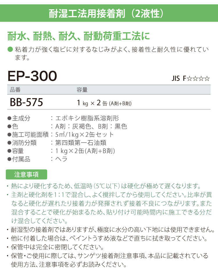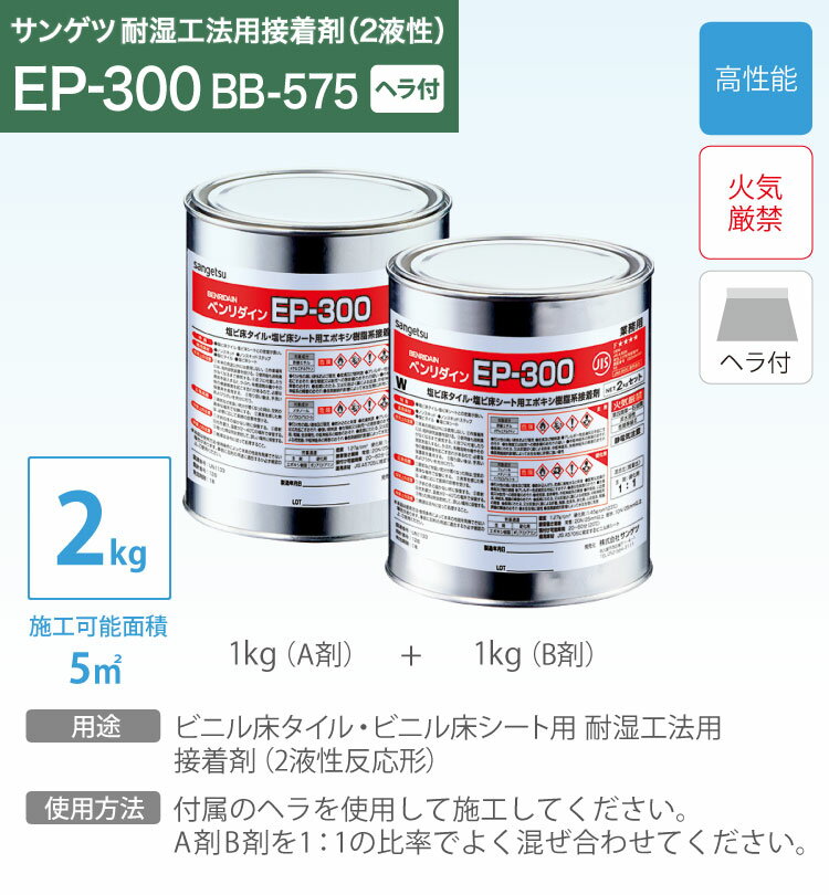 【送料無料】サンゲツ 耐湿工法 2液型 接着剤 ベンリダイン EP-300 BB-575 1kg×2缶(A+B)/セット ヘラ付き[販売単位 1セット]日本製 商品の詳しい情報ブランド名サンゲツ:SANGETSU品種耐湿工法用接着剤(2液性)商品名ベンリダイン EP-300BB-575(BB575)商品PR耐水、耐熱、耐久、耐動荷重工法に●粘着力が強く塩ビに対するなじみがよく、接着性と耐久性に優れています。内容量1kg×2缶(A剤+B剤)/セット主成分エポキシ樹脂系溶剤形施工可能面積5m²/2kg付属品ヘラオープンタイム(20℃)20〜30分貼付可能時間(20℃)40〜60分対応工法(一般工法)吸水性あり 水分計グレードI対応工法(耐湿工法)吸水性なし・少ない 水分計グレードIIaホルムアルデヒド放散量区分JIS F☆☆☆☆ご注意火気厳禁溶剤形接着剤は労働安全衛生法・消防法によって取り扱い方法・保管方法に制限があります。各種法令をご確認ください。下地に塗布した接着剤を容器に戻さないでください。詳細はサンゲツ接着剤注意事項をご参照下さい。注意事項※付属のヘラを使用して施工してください。※熱により硬化するため、低温時(5℃以下)は硬化が極めて遅くなります。※主剤と硬化剤を1:1で混合し、よく撹拌してから使用してください。比率が異なると硬化が遅れたり接着力が発揮されず接着不良につながります。また混合することで硬化が始まるため、貼り付け可能時間内に施工できる分だけ混合してください。※付属のヘラを使用して施工してください。※耐湿型の接着剤ではありますが、極度に水分の高い下地には使用できません。※他に付着した場合は、ペイントうすめ液などで直ちに拭き取ってください。※保管中は完全に密閉してください。※保管・ご使用に際しては、サンゲツ接着剤注意事項、本品に記載されている使用方法、注意事項を必ずお読みください。 メーカー希望小売価格はメーカーカタログに基づいて掲載しています サンゲツ接着剤注意事項> ベンリダインシリーズ 接着剤選択上のご注意> 使用上のご注意> 施工上の注意事項 優れた耐久性。耐動荷重工法に耐湿工法用接着剤 EP-300 別サイズ現在のページですEP-300 BB-584 9kg×2缶セット ベンリダインシリーズの別商品はこちらWG BB-603 5kgWPX BB-480 5kg ページの上へ モバイルページ