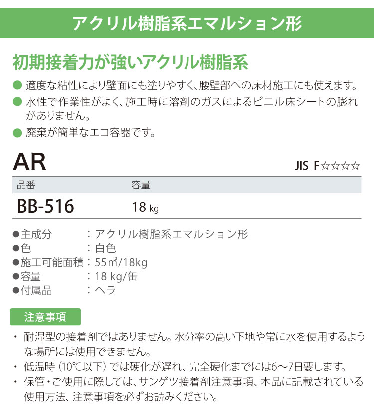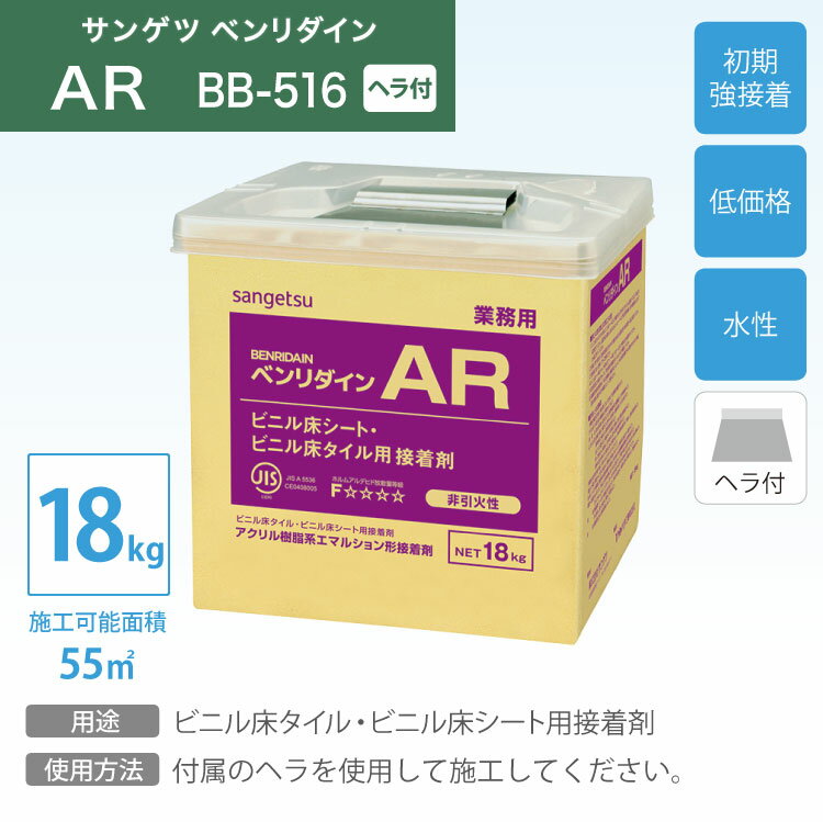 【送料無料】サンゲツ 水性 ビニル床タイル ビニル床シート 用 アクリル樹脂系 エマルション形 接着剤 ベンリダイン AR BB-516 18kg ヘラ付き[販売単位 1缶]日本製 商品の詳しい情報ブランド名サンゲツ:SANGETSU品種アクリル樹脂系エマルション形商品名ベンリダイン ARBB-516(BB516)商品PR初期接着力が強いアクリル樹脂系●適度な粘性により壁面にも塗りやすく、腰壁部への床材施工にも使えます。●水性で作業性がよく、施工時に溶剤のガスによるビニル床シートの膨れがありません。●廃棄が簡単なエコ容器です。内容量18kg/缶施工可能面積55m²/18kg付属品ヘラオープンタイム(20℃)10〜20分貼付可能時間(20℃)40〜60分ホルムアルデヒド放散量区分JIS F☆☆☆☆注意事項※耐湿型の接着剤ではありません。水分率の高い下地や常に水を使用するような場所には使用できません。※低温時(10℃以下)では硬化が遅れ、完全硬化までには6〜7日要します。※保管・ご使用に際しては、ベンリダイン注意事項、本品に記載されている使用方法、注意事項を必ずお読みください。備考ビニル床タイル・ビニル床シート用接着剤付属のヘラを使用して施工してください。 メーカー希望小売価格はメーカーカタログに基づいて掲載しています サンゲツベンリダイン注意事項> ベンリダインシリーズ選択上のご注意> 使用上のご注意> 施工上の注意事項 初期接着力が強いアクリル樹脂系。ビニル床の施工に一般工法用接着剤 AR 別サイズ現在のページですAR BB-517 3kg 施工の必需品や床材をキレイに保つお手入れ用品など床用副資材ページはこちら ページの上へ モバイルページ