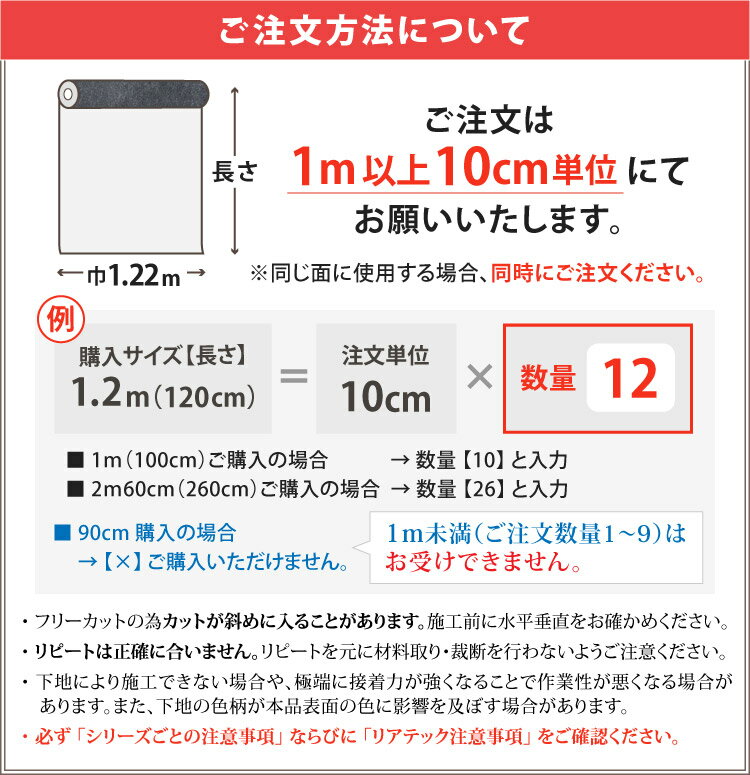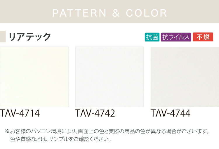 サンゲツ リアテック 日本製 抗ウイルスリアテック 122cm巾 無地 単色 [1m以上10cm単位 切り売り] 商品の詳しい情報ブランド名サンゲツ品種粘着シート商品名REATEC(リアテック)抗ウイルスリアテック | 単色掲載品番TAV4714 TAV4742 TAV4744商品PR表面コーティングにより抗ウイルス性能と抗菌性能をもつリアテックです。SIAA 抗ウイルス加工認証製品、SIAA 抗菌認証製品の為、安心してご使用いただけます。規格122cm巾素材塩化ビニル厚さ約0.2mm取引単位1m以上10cm単位不燃詳しくはシリーズ別の商品情報「防火認定」の項目をご確認ください。ホルムアルデヒド放散等級F☆☆☆☆抗菌抗菌のマークがある品番について、表面に付着した細菌の増殖を抑制する効果があります。抗ウイルス表面に付着したウイルスに効果のある商品です。注意事項※すべての細菌の増殖を抑制するものではありません。※屋外や浴室、水まわりなどに使用しないでください。※下地により、施工ができない・極端に接着力が強くなり作業性が悪くなる可能性がございます。「リアテック注意事項」を必ずご確認下さい。※画面上、色合いなど実際の商品と若干の違いがある場合がございます。 メーカー希望小売価格はメーカーカタログに基づいて掲載しています サンゲツ 粘着剤付化粧フィルムリアテック注意事項施工上の注意保管・運搬・メンテナンス上の注意製品仕様・各種性能シリーズ別の注意事項 リアテック用 下地処理剤幅広い用途に速乾性ベンリダインRTII強い密着力を発揮ベンリダインRP-100溶剤臭の少ない水性ベンリダインRA伸び易く塗ムラ少ないベンリダインRS ページの上へモバイルページ品番TAV-4714 TAV-4742 TAV-4744防火認定1-4施工上のご注意シリーズ別の注意事項ページ内の【抗ウイルス(S)】をお読みください