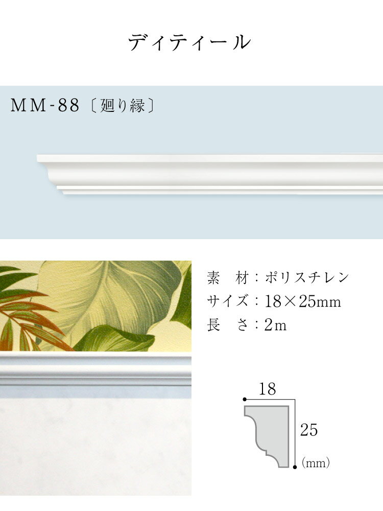 サンゲツ モールド 装飾用見切り材 MM-88 ポリスチレン製 天井 廻り縁 見切材 2m[販売単位 1本] 商品の詳しい情報ブランド名サンゲツ品種モールディング商品名モールド 装飾用見切り材MM-88商品PR天井の廻り縁や腰壁の見切り、額縁などに使用することで、インテリアをエレガントに演出します。・ヨーロッパの伝統的なインテリアからモダンスタイルまで、高いデザイン性・寸法安全性に優れ、加工性もよく作業効率もアップ素材ポリスチレン表面加工フィルムラッピング※アクリル+ウレタンフィルムサイズ18mm×25mm長さ2m施工・注意事項※高い寸法性を持っていますが、若干の寸法差が生じる可能性があります。※製造工程上、多少の色差が生じる可能性があります。※端は凹みや印刷の欠落があります。モールドの端部は必ず両端数mmをカットしてください。※モールドが施工面に接する所にムラなく接着剤をつけ、施工面との取り合いを確認しながらフィニッシュガンで釘止めしていきます。※下地の不陸などが加わり、商品表面の段差が大きくなることがあります。その場合、ベニアクサビなどで調整し、コーキングタッチアップしてください。仕上げ※隙間や段差の生じた部分にはコーキングを注入します。※塗装仕上げは不要です。※お好みの色に塗装する場合、サンディング・シーラー処理が必須。 メーカー希望小売価格はメーカーカタログに基づいて掲載しています モールドと合う輸入壁紙を見つけるおしゃれな輸入壁紙でお部屋に差をつけよう モールド全商品はこちら ページの上へ モバイルページ