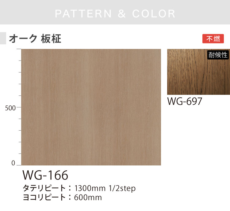 実際の商品はこちらダイノック™ ウッドグレインWG-166 他 全10色 122cm巾 ページの上へモバイルページ品番WG-166 WG-697防火認定6-3施工上のご注意WG-166は、フィルム表面に特殊な加工をしていますので、施工の際は突き合わせ貼りを避け、目透かし貼りもしくは目地棒をご使用ください。 品番WG-695 WG-696防火認定6-3 品番WG-943防火認定6-3 品番WG-2430 WG-2431 WG-2432 WG-2433 WG-2434防火認定6-3 実際の商品ページはこちら