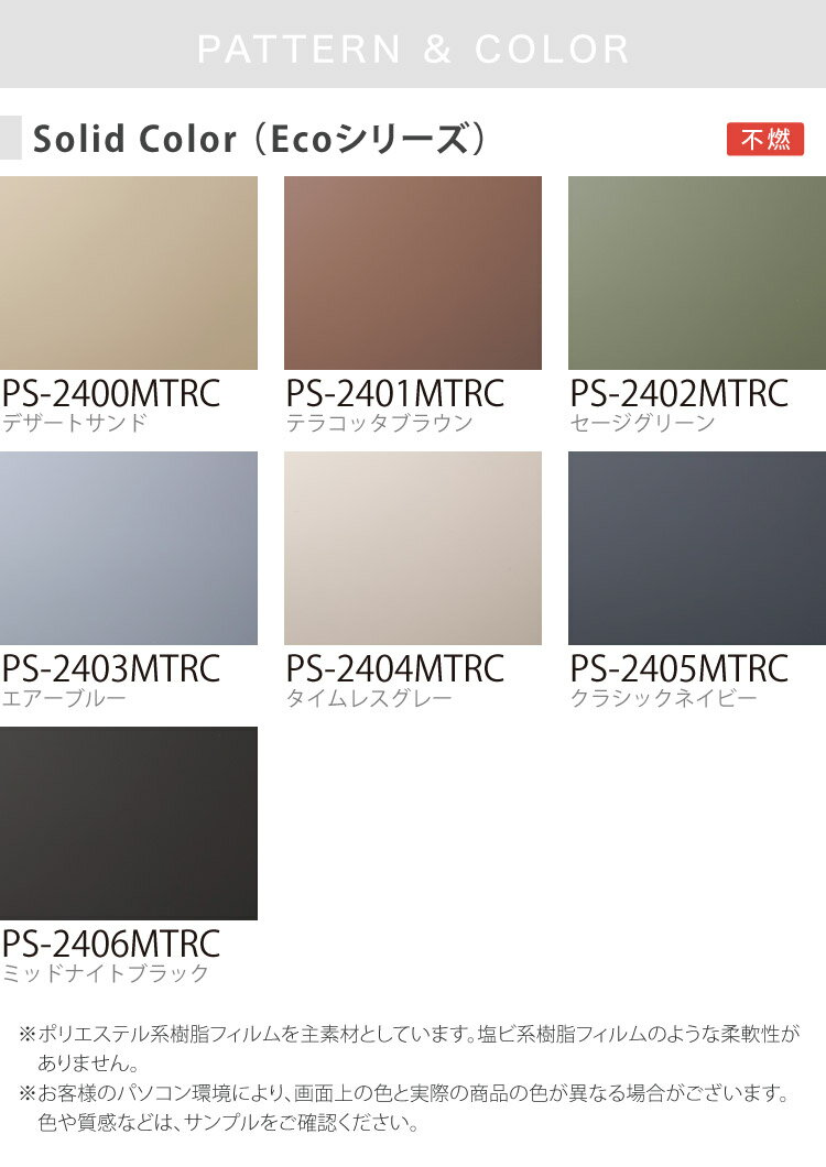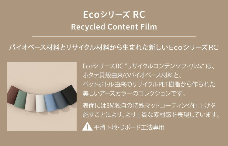 商品の詳しい情報ブランド名3M™品種粘着シート商品名DI-NOC™(ダイノック™)カラー | デザートサンド テラコッタブラウン セージグリーン エアーブルー タイムレスグレー クラシックネイビー ミッドナイトブラック掲載品番PS2400MTRC PS2401MTRC PS2402MTRC PS2403MTRC PS2404MTRC PS2405MTRC PS2406MTRC商品PRホタテ貝殻由来のバイオベース材料と、ペットボトル由来のリサイクルPET極脂から作られた美しいアースカラーのコレクションです。規格122cm巾素材ポリエステル厚さ約0.1mm取引単位1m以上10cm単位不燃詳しくはシリーズ別の商品情報「防火認定」の項目をご確認ください。ホルムアルデヒド放散等級F☆☆☆☆注意事項※下地により、施工ができない・極端に接着力が強くなり作業性が悪くなる可能性がございます。「ダイノック™注意事項」を必ずご確認下さい。※画面上、色合いなど実際の商品と若干の違いがある場合がございます。 メーカー希望小売価格はメーカーカタログに基づいて掲載しています ダイノック™ 注意事項ダイノック™ 施工手順施工上の注意保管・輸送・メンテナンスの注意製品仕様・各種性能シリーズ別の注意事項 ダイノック™用 下地処理剤広い面積施工時に 希釈タイプEC-1368NT重ね貼り・多様な下地にDP-900N3施工の位置調整が比較的容易WP-137M初期粘着力の強い水性WP-2000 ページの上へモバイルページ品番PS-2400MTRC PS-2401MTRC PS-2402MTRC PS-2403MTRC PS-2404MTRC PS-2405MTRC PS-2406MTRC防火認定6-3施工上のご注意シリーズ別の注意事項ページ内の【(1)基材表面の平滑性注意】【(2)フィルム表面の傷付き注意】【(3)施工後の照明環境注意】【(7)3次元曲面への施工不可】【(8)マットシリーズ】【(11)Eco(PS-MTRC)シリーズ】をお読みください・下地のわずかな不陸も拾いやすいため、平滑な下地専用の製品です。・とても薄くコシが弱いため、シワになりやすく折れやすいので、施工の際には特にご注意ください。・裂けやすいため、施工の際には特にご注意ください。・製造上の理由により点状の光沢違いが見かけられる場合があります。点状の光沢違いが見られる箇所には赤ラベルを表示していますので、その箇所は使用しないでください。