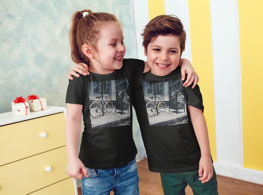 tシャツ キッズ 半袖 黒地 ブラック デザイン 90 100 110 120 130 140 150 160 Tシャツ ティーシャツ T shirt 010828 自転車 写真 黄色