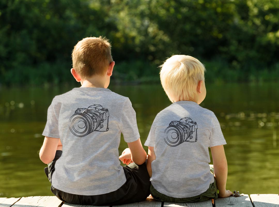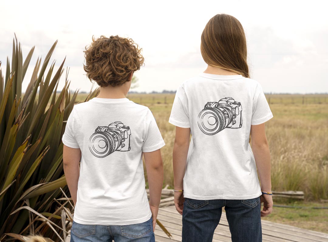Tシャツ キッズ バックプリント 半袖 白地 デザイン 90 100 110 120 130 140 150 Tシャツ ティーシャツ T shirt 014761 カメラ 白黒 一眼レフ