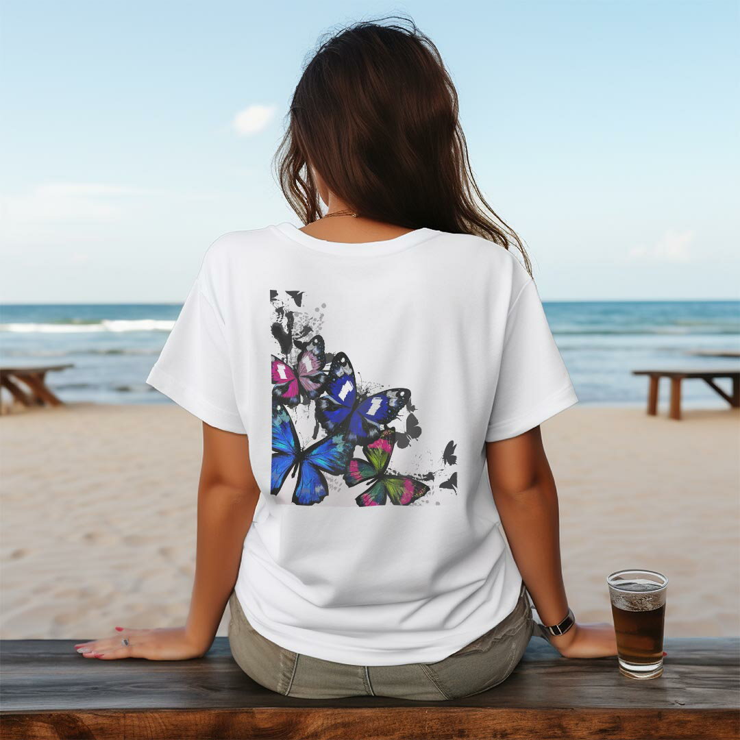 レディース ドライバックプリントTシャツ ホワイト 半袖 4.1オンス ジム トレーニング スポーツ 運動会 ドライアスレチック UVカット 紫外線遮蔽 吸水速乾 デザイン Tshirt M L 011426 蝶 ペイント カラフル