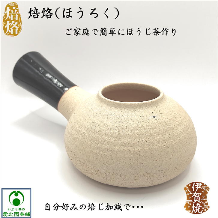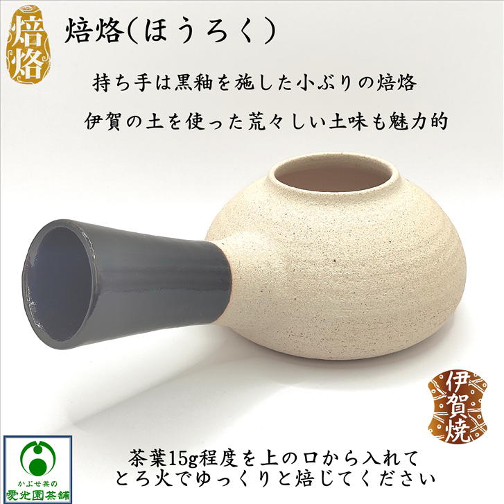 商品情報生産地三重県(伊賀焼)寸法■外形寸法 ・胴外径: 約128mm ・全長: 約220mm■内径寸法・胴上部開口部内径: 約54mm ・胴横開口部内径(持ち手接続部分の内径): 26mm・持ち手端部内径: 約39mm ※持ち手は黒釉を施釉(注)手作りの焼き物ですので個体差があります。記載の寸法はおおよその目安としてお考えください。その他■お試し用の茶葉を30gお付けしております。茶名: ほうじ茶用茶葉原材料: 緑茶(三重県産)内容量: 30g賞味期限: 約6ヶ月■使用中、持ち手が熱くなる場合は、火傷防止のため、耐熱のミトンや手袋などを使用してお持ちください。■実物の見え方や色合いをできる限り再現できるようにしておりますが、カメラの遠近感での見え方の違いや照明の光の加減、お使いのパソコンやスマホなどによって色合いの違いがでる場合がございます。予めご了承ください。■手作り品ですので色合い、形状など個体差がございます。予めご了承ください。焙烙 ほうろく お試し用茶葉付き 焙じ器 ほうじ器 焙じ ほうじ茶作り 伊賀焼 陶器 耐熱 耐熱陶土 焙煎 炒り器 ほうじき いりき ばいせん 耐熱焙じ器 直火 直火対応 直火OK 黒色 ブラック 黒釉 家庭焙煎 手軽 簡単 趣き シック 落ち着き お洒落 使いやすい プレゼント ギフト ほうじ茶をご家庭でも手軽に簡単に作れる焙烙(ほうろく)。お試し用茶葉付きで自分好みに焙じて、香り良い美味しい「ほうじ茶」をどうぞ。ほうじ茶ラテやスイーツなどにもご活用ください。 届いてすぐに手作り焙煎の「ほうじ茶」をお楽しみいただけるように、お試し用の茶葉を30gお付けしております。−−−−−−−−−−−−−−−−−−−−自分のお好きな茶葉をお好きな焙じ加減で、手軽に簡単に自分オリジナルのほうじ茶が作れます。色々な茶葉を試してほうじ茶を探究するのもいいものです。焙煎している時のほうじ香もまたいい匂いでリラックスでき、ゆったりとした時間の流れが楽しめます。また、どんなほうじ茶になるかな・・・。■ほうじ茶作りの場合(一例です)使用する分の茶葉約15g程度を焙烙に入れ、火加減はとろ火で、軽く揺すりながら焙じてください。焙じ香が漂い、少し茶色になってくれば、火を止め、残熱で軽く揺すりながら、全体が焙じられて茶色くなれば完成です。香り良いほうじ茶をお楽しみください。※一度にたくさんの茶葉を焙烙に入れますと、揺すっても全体がうまく混ざらなく、熱の入りが偏って、焙じ過ぎの部分と焙じができていない部分ができてしまい、ほうじ茶の味わいが損なわれます。最初は、15g程度の少なめの茶葉の量から始めて、様子を見ていただく方が良いです。※焙じ器は陶器ですので、一度温度が上がりますと冷めにくいですので、茶葉が一部茶色くなり始め、焙じ香が漂い始めましたら、火を止め、焙じ器の残熱だけで、揺すりながら全体に熱が入るように焙じてください。茶葉全体が茶色くなるまで、火にかけますと、残熱で茶葉が直ぐに焦げてしまいますのでご注意ください。■■■ ■■■屋内はもちろん、屋外のアウトドアなどでこってりした料理やバーベキューや焼き肉のあとに軽く焙じて飲んだりするとお口の中もスッキリ。ほうじ茶ラテにしても美味しいですよね。色々なシーンで美味しく活用してみてはいかがでしょうか!!ほうじ茶だけではなく、ゴマ、豆や銀杏などを炒るのにも使えます。※焙烙使用後は必ず自然冷却させてください。 使用後の熱い状態で水を掛けると割れることがありますので、ご注意ください。 8