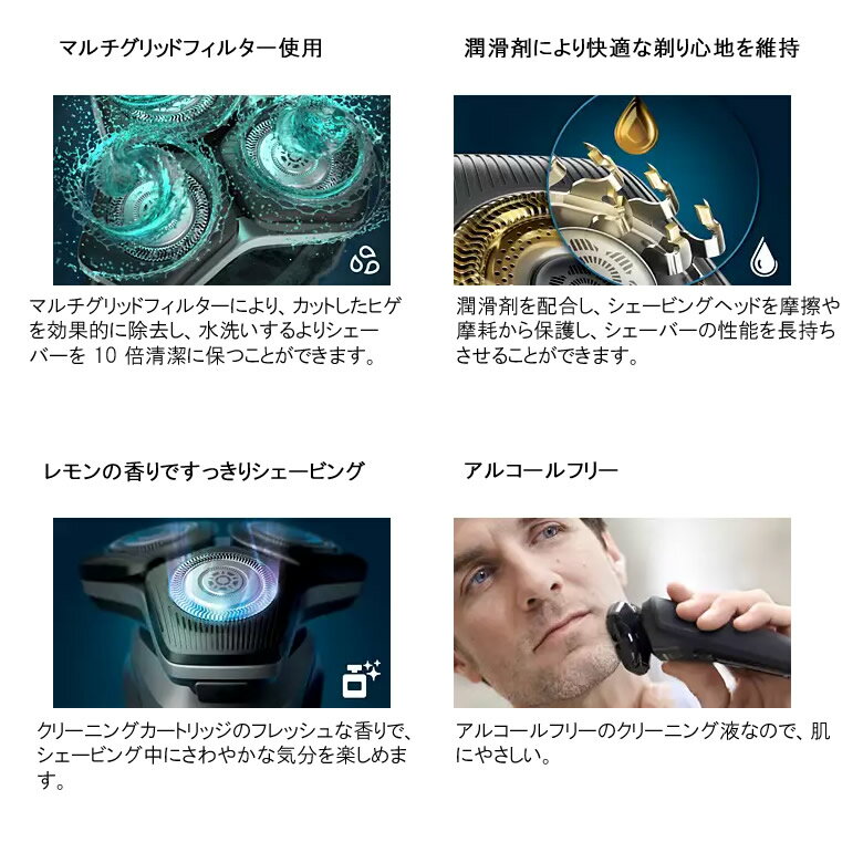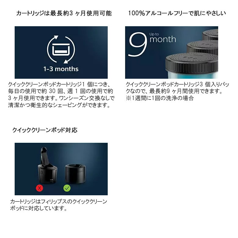 クイッククリーンポッドカートリッジ PHILIPS CC13/51フィリップスシェーバー クイッククリーンポッド専用 洗浄液 3個入りパック 【製品仕様】 品番 PHILIPS CC13/51 [CC1351] カートリッジ 3 個 x 160 ml 対応機種 ■クイッククリーンポッド Series 9000/Series 7000/Series 5000 S9987 S9985 S9982 S7782 S7786 S5586 特徴 毎日新品のような使い心地 毎使用後にシェーバーをクイッククリーンポッドで洗浄して、新品のような使い心地を維持しましょう。水洗いよりシェーバーを 10 倍清潔に保つことができます*。 ■マルチグリッドフィルター使用 マルチグリッドフィルターにより、カットしたヒゲを効果的に除去し、水洗いするよりシェーバーを 10 倍清潔に保つことができます*。 ■潤滑剤により快適な剃り心地を維持 潤滑剤を配合し、シェービングヘッドを摩擦や摩耗から保護し、シェーバーの性能を長持ちさせることができます。 ■レモンの香りですっきりシェービング クリーニングカートリッジのフレッシュな香りで、シェービング中にさわやかな気分を楽しめます。 ■アルコールフリー アルコールフリーのクリーニング液なので、肌にやさしい。 ■カートリッジは最長約3 ヶ月使用可能 クイッククリーンポッドカートリッジ1 個につき、毎日の使用で約 30 回、週 1 回の使用で約 3 ヶ月使用できます。ワンシーズン交換なしで清潔かつ衛生的なシェービングができます。 ■100%アルコールフリーで肌にやさしい クイッククリーンポッドカートリッジ3 個入りパックなので、最長約9 ヶ月間使用できます。※1週間に1回の洗浄の場合 ■クイッククリーンポッド対応 カートリッジはフィリップスのクイッククリーンポッドに対応しています。