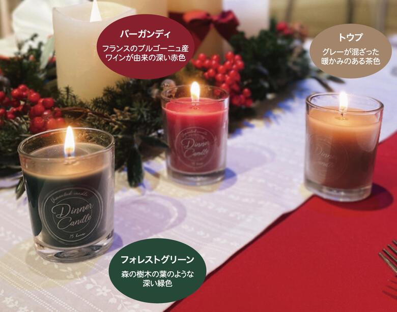 クリスマスのテーブルコーディネートを彩る ディナーキャンドル 【製品仕様】 型式/品番 A4800030 本体サイズ外形寸法 (約)直径Φ52 mm×高さ62 mm 本体質量 約 - g 香り 無香 燃焼時間 約15時間燃焼時間は無風・気温20~28度前後の環境下における平均値です。湿度・気温・風など使用状況により変動します。 材質 ガラス・パラフィン(ロウ) 保証期間お買い上げ日より 電気製品ではないため、保証はありません 特徴 バリエーション豊かなキャンドル。もっと日常に取り入れたり、パーティーの演出など、さまざまなシーンで使いたいですよね。身の回りにあるものをちょっとアレンジしただけで、たちまちキャンドルが毎日のパートナーに。飾ってオシャレ、火を灯してムード満点。あなただけのキャンドルライフを見つけてみましょう。 クリスマスカラーのグラスキャンドルでテーブルコーディネート。 無香タイプのため、お食事の時でもご利用いただけます。 ギフトラッピング 想いを込めたラッピング無料で承ります♪贈り物で大変喜んでいただいてます。ラッピング、のし、メッセージカード など、ご希望のギフトオプションを提供しております。大切な人へのギフトは、カデココにお任せください! 【結婚祝い】 二人の門出を祝って贈りたいプレゼント 結婚祝い・結婚内祝い・二次会・ビンゴ・抽選会・景品などのイベントにあったプレゼント・贈り物 【出産祝い】 赤ちゃんが生まれた時に贈りたい 出産祝い・ 男の子・女の子・出産内祝い・産休・プチギフト 【誕生日・記念日】 一年に一度、誰もが迎える大切な日に贈りたい 誕生日・彼氏・彼女・夫・妻・結婚記念日・サプライズ 【引越・新築祝い】 大切な人の新しい暮らしをお祝いする 新築マンション・新築一戸建て・新築祝い お返し 【昇進・定年祝い・退職祝い】 お世話になった方の昇進や定年祝いに贈りたい 父親・母親・兄弟・子供・友達へ・仕事仲間へ 【母の日】【父の日】【敬老の日】【還暦祝い】 【バレンタイン】【ホワイトデー】【クリスマス】 【入学祝い】【卒業祝い】【成人祝い】 【夏ギフト】【お中元】【お歳暮】 関連キーワード 北欧風インテリア、お洒落なデザインのボックス入りで、贈り物にも最適、雑貨 置物 オブジェ オーナメント ツリー シンプル 玄関 リビング ディスプレイ 飾り テーブルランプ ディスプレー 店舗 カフェ バー イルミネーション クリスマス ミニ 卓上 電飾 ほくおう プレゼント ギフト 贈り物 関連商品心を込めたラッピング♪無料(メッセージカード・熨斗も承ります) テーブルコーディネートを彩る ディナーキャンドル 「フォレストグリーン」森の樹木の葉のような深い緑色 無香 心を込めたラッピング♪無料(メッセージカード・熨斗も承ります)