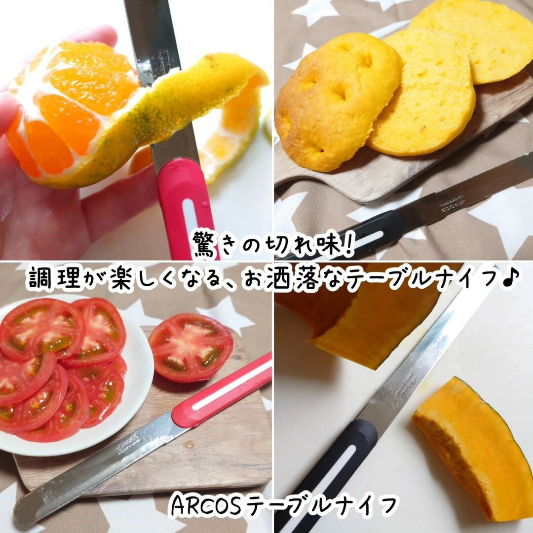 カラフルでおしゃれなテーブルナイフ 【製品仕様】 型式/品番 ブラック/ホワイトライン 373624パール/ブラックライン 373657ストロベリー/ホワイトライン 373652キウイ/ホワイトライン 373651オレンジ/ホワイトライン 373656 本体サイズ 全長:215mm、刃部:100mm、幅:17mm 重量 28g 原産国 スペイン 材質 刃部:NITRUMステンレス鋼ハンドル部:ポリプロピレン 食洗機 使用可 注意 本品は鋭利な刃物ですのでお子様の手が届かない場所に収納してください。また付属のビニールサックは破損しやすいのでご注意下さい。 特徴 スタイリッシュなデザインで切れ味が良く、固いバゲットも柔らかい食パンも、パンが潰れることなくスパッと心地よくカットできます。もちろんフルーツや表面が固いトマトなどの野菜も、ベーコン、ハム、チーズ、分厚いステーキなどもお皿の上で快適にカットできます。秘密はとても細かい仕上げの波刃とARCOS独自のステンレスの硬度。これにより、固くて切り口が汚くなりがちな食材も、柔らかすぎて潰れてしまいがちな食材も、気持ちよくきれいにカットできます。 バターナイフのように先が丸くなっているので、テーブルにおいても怖くありません。もちろんバターナイフとしてもお使いになれます。テーブルの上で切ったり塗ったり、1本で何役もこなせる便利なナイフです。 ステンレス製で錆びにくく長持ち。食洗機にも対応。 食材の破片等が刃部に残っていると大変不衛生ですので、ご使用後は必ず台所用洗剤とスポンジでよく洗い、十分に流水で洗い流してください。 ■卓越した切れ味 アルコス独自のニトラム(高窒素ステンレス合金)を使用。切断力が強く、どんなものでもスパッと切れちゃいます。 ■動かしたときにだけ切れる 細かいギザ刃になっていて、動かしたときにだけ切れます。カット部分がつぶれるのを防ぎ、なめらかな切り口に。 ■使いやすさ抜群 先が丸いのでカットだけでなく、塗るのにも使えて食卓でマルチに活躍します。コンパクトで軽量、食洗機で洗えて、省スペース。 関連キーワード メーカーについて【よく切れる ARCOS テーブルナイフ】ARCOS(アルコス)は1734年にスペインのアルバセテという小さな町で生まれたテーブルナイフや調理ナイフ専業の会社。この町は短剣や包丁を生み出すための鉄鋼資源や鍛冶屋、そして良質な刃物を求める商人で昔からにぎわってきました。地中海に面するスペインは肉や魚、素晴らしい食材にあふれています。人々は食材をワクワクしながら調理しています。