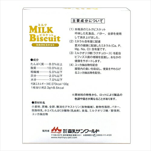 乳製品・バター・全卵を使用した本格派のミルクビスケット吟味した乳製品、バター、全卵を使用して焼き上げた、本格派のミルクビスケットです。 愛犬の健康に配慮したミネラル(Ca、P、mg、Na、Cl)含有量に配慮しています。 ミルクオリゴ糖(ラクチュロース)を配合で、ビフィズス菌の増殖を促進し、おなかの健康をサポートします。 ユッカ抽出物(ユッカはユリ目リュウゼツラン科の植物)を配合で、便の臭いをやわらげる働きのあるサポニンを含んでいます。原材料(成分):小麦粉、蔗糖、全卵、難消化性デキストリン(食物繊維)、動物性脂肪、乳製品、バター、食塩、膨張剤、ミルクオリゴ糖、ユッカ抽出物保証成分:たんぱく質8.0%以上、脂質10.0%以上、粗繊維5.0%以下、灰分2.0%以下、水分7.0%以下エネルギー:370kcal/100g (1枚当り:約2.3g≒8.5kcal)給与方法:「1日当りの給与量」 超小型犬(5)・・・10個以内 小型犬(10)・・・15個以内 中型犬(20)・・・25個以内 大型犬(30)・・・35個以内 ・1日2〜3回に分けてお与えください。賞味/使用期限(未開封):18ヶ月賞味期限表記:2:yyyy/mm原産国または製造地:日本