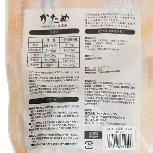 新鮮な九州産のささみを使用!着色料・保存料・酸化防止剤不使用。100%九州産の鶏食肉を使用しています。小麦粉等の粉類は不使用のグルテンフリーのおやつ。九州の工場で生産加工しております。嗜好性が高いのでしつけ・ご褒美に最適です。[給与方法][1日当たりの標準給与量]幼犬(生後6ヶ月)~:2~5g、超小型犬(1~5kg):5~15g、小型犬(5~10kg):15~30g、中型犬(10~25kg):30~50g、大型犬(25kg以上):50~70g・上記給与量を基準にして、1日1~2回に分けてお与えください。・与える量や大きさは、体調、年齢、季節、運動量、妊娠期などにより異なりますので状況により調整してください。・歯の生えそろわない幼犬には与えないでください。・愛犬の食べ方や習慣によっては、のどに詰まらせることがありますので必ず観察しながらお与えください。生産地:日本パッケージサイズ:W150×H240×D25mm/重量60g<原材料>国内鶏肉(九州産)<保証成分>粗たん白質73.5%以上、脂質4.3%以上、粗繊維0.1%以下、粗灰分4.1%以下、水分17.8%以下<エネルギー>334kcal/100g注意事項・時間の経過による色や硬さの変化が見られても品質には影響ありません。・製品の表面に白い微粉(アミノ酸・カルシウム)が付着する場合がありますが、品質に影響ありません。・子供が愛犬に与える時は安全のために大人が立会い、手などを噛まれないようにご注意ください。・幼児、子供、ペットの届かない所に保管してください。・おいしさを保つための脱酸素剤は食べられません。また、開封後は効果がなくなりますのでお捨てください。※リニューアルに伴い、パッケージ・内容等予告なく変更する場合がございます。予めご了承ください。