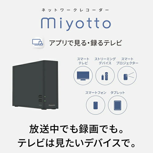 放送中でも、録画でも。テレビは見たいデバイスで。 外出先でも、テレビのない自室でも、さまざまなデバイスでテレビ番組を楽しめる miyottoがあれば、もうテレビの前に座る必要はありません。 スマートフォン、タブレット、スマートテレビ、スマートプロジェクター、PCモニターなど、お好きなデバイスで、見たい時に、見たい場所で、見たいスタイルでテレビ番組を楽しめます。 今まさに放送されている番組はもちろん、miyottoに録画した番組も、いつでもどこでもあなたの「見たい」を叶えます。 録画中でも、番組を楽しめる 録画中でももちろんテレビ番組を楽しめます。見たい番組を録画している間に別のチャンネルの番組をリアルタイムで視聴したり、録画した別の番組を楽しむことができます。 家族みんな、見たい番組を楽しめる 録画番組や放送中の番組も、最大2台の異なるデバイスで同時に視聴できます※。家族がリビングのテレビでバラエティを見ている間に、自室でスマートフォンでドラマを楽しんだり。家族やパートナーと、それぞれの見たい番組を、それぞれのデバイスでストレスなく楽しめます。 ※宅内視聴の場合は最大2台。宅外の場合は1台のみ。 ※2番組以上を同時に録画しているときは、複数のデバイスで同時に視聴できない場合があります。 見たい番組がすぐに見つかる 音声検索 アプリの音声検索画面で、リモコンの音声認識ボタンを押して話しかければ、番組名や出演者名をかんたんに入力することができます。 最大2倍速。お好みの速さで再生できる ニュース番組を効率よくインプットしたい時には2.0倍速、ドラマやアニメをサクサク見たい時には1.5倍速や1.3倍速など、番組に合わせて再生速度を3段階から選択可能。2.0倍速なら、1時間の番組が30分で視聴できます。 どこに置いても、家じゅうどこでも楽しめる miyotto本体には電波の透過性に優れた樹脂素材を使用、最適なアンテナ配置を採用することで、より安定した無線LAN接続を目指しました。無線LANルーターから離れた場所にmiyottoを設置しても、テレビを楽しめます。 ワイヤレス&コンパクトだから置き場所を選ばない 映像出力のケーブルを直接つながなくても使えるので、ディスプレイ機器の近くに設置する必要がありません。また、コンパクトなので、ちょっとした隙間や棚の中、作業机の上など、置き場所を選ばず設置ができます。 かんたんセットアップで、すぐに使える 無線LANルーターとの接続、アンテナ線をつなくだけで設置が完了。本体の初期設定はたったの4ステップ。かんたんにセットアップが完了するので、商品が届いたその日からお使いいただけます。 3番組同時録画で、「見たい」が重なっても諦めない ハイビジョン放送を最大3番組同時に録画できるから、ゴールデンタイムのドラマも、スポーツ中継も、バラエティ番組も、もうどれかを選ぶ必要はありません。家族と録画したい番組の時間帯が被っても、逃さず録画します。 外出先からスマホで録画予約。もう録り逃さない 見たい番組の録画予約を忘れ時も、見たい番組の放送時間に帰宅が間に合わない時も、いつでもどこでもスマートフォンから録画予約ができるので、見たい番組を録り逃す心配がありません。 内蔵HDD 2TBでたっぷり録画 2TBのHDDを内蔵。15倍録にも対応しているので、最大約1920時間分の番組を録画できます。番組ごとに録画画質を変えてHDDを効率よく使えば、「見たい」を諦めることなく、たっぷり録りためることができます。 miyotto アプリ miyotto アプリをインストールすれば、スマートフォンやスマートテレビ、スマートプロジェクターなど、さまざまなデバイスでテレビ番組や録画番組が視聴、再生できるようになります。 【対応OS/プラットフォーム】 テレビ用視聴アプリ : Fire OS / Google TV(TM) / Android TV(TM) スマホ用視聴アプリ : iOS / Android(TM) ※BS/110度CSによる4K・8K放送について BS/110度CSによる4K・8K放送(4K8K衛星放送)の受信および録画機能、録画した映像の再生機能は搭載されていません。 【仕様・スペック】 ■録画メディア HDD(ハードディスク内蔵):2TB USB-HDD: ・USB3.0/USB2.0 ・160 GB 以上8 TB 以下 ・登録可能台数:最大8 台まで(同時接続台数は1 台のみ) ■録画方式 録画圧縮方式: ・MPEG-2(DRモード) ・MPEG-4 AVC/H.264 (3倍録~15倍録) 映像信号方式:NTSC 録音方式: ・MPEG-2 AAC:最大5.1ch ・ドルビーデジタル:2ch デジタルハイビジョン:○ 地上デジタル放送方式(日本)、衛星デジタル放送方式(日本) ■録画時間 内蔵HDD録画時間: ・DR(地上デジタル/HD放送:17Mbps):約244時間 ・DR(BSデジタル/HD放送:24Mbps):約175時間 ・DR(BSデジタル/SD放送:12Mbps):約341時間、3倍録:約499時間、5倍録:約792時間、10倍録:約1416時間、15倍録:約1920時間 ■放送受信 チューナー数:3(地D/BS/CS×3) 地上デジタル入力:VHF1~12ch,UHF13~62ch、CATV C13~C63ch(CATVパススルー対応) BS・110度CSデジタルIF入力:○ 予約プログラム数(予約可能表示):128番組 ■記録番組数 5,000番組(USB-HDD:10,000番組) ■入出力端子 USB端子:1(USB3.0 1