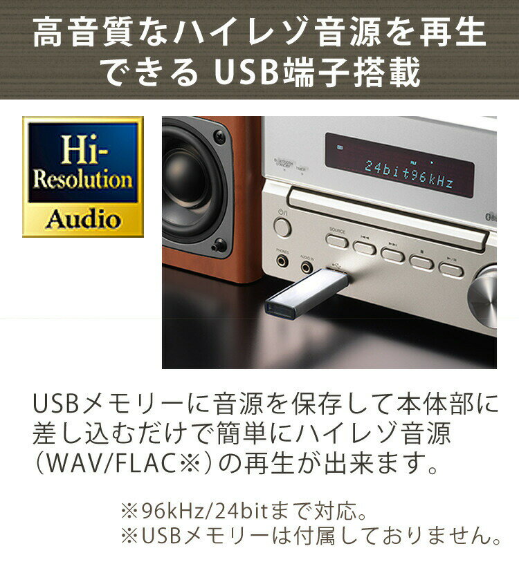 必ずご確認ください こちらの商品は商品箱に潰れやへこみ、シール剥がし跡のある商品です。 商品箱には傷がありますが、製品は新品(未使用)の状態となります。 ※箱の破損に伴いまして、商品にも小さな傷がある場合もございます。その点予めご了承ください。 メーカー保証は新品同様1年間つきますので、保証書は納品書と一緒に保管いただきます様お願いいたします。 保証情報 等 ▼ミニコンポ ケンウッド XK-330 【メーカー保証】1年間 【付属品】リモコン・リモコン用単4乾電池(2本)・スピーカーコード(1.5m 2本)、AMケーブルアンテナ・FM簡易型アンテナ 型名 XK-330 アンプ 実用最大出力 10W+10W(JEITA 6Ω) AUDIO IN(ステレオミニ)端子 アナログ×1 PHONES(ヘッドフォン)端子 1 PHONES(ヘッドフォン)端子再生帯域 30Hz - 40kHz※5 USB端子 1 USB部※1 仕様 USB2.0フルスピード ファイルシステム FAT16/32 再生可能ファイル※2 WAV/FLAC(96kHz/24bit)、MP3、WMA CD部 再生可能ディスク※2 音楽CD、CD-R/RW(MP3、WMA) チューナー部 受信周波数範囲 FM:76.0MHz〜95.0MHz(ワイドFM対応)※3、 AM:531kHz〜1,602kHz サウンド 重低音再生 ○ BASS/TREBLE音質調整 ○ タイマー 再生タイマー ワンスタイマー/デイリータイマー スリープタイマー ○ Bluetooth部※4 規格 ver2.1+EDR 対応プロファイル/コーデック A2DP、AVRCP/SBC スピーカー部 形式/使用スピーカー(1本) 2ウェイバスレフ型/80mmコーン型ウーファー、 19mmドーム型ツィーター、インピーダンス 6Ω 再生帯域 60Hz - 40kHz 電源 AC100V 50/60Hz 消費電力 定格消費電力 12W Bluetoothスタンバイ時 4.0W以下 待機時消費電力 0.40W以下 最大外形寸法 本体部 W180×H123×D224mm/1.8kg スピーカー部(1本) W102×H181×D158mm/1.7kg 付属品 FM簡易型アンテナ、AMループアンテナ、リモコン、 単4形乾電池×2(リモコン動作確認用)、スピーカーコード ※こちらのコンポは録音機能はなく、再生専用です。 ※1:USBマスストレージクラスに対応。USBメモリーは付属しておりません。 ※2:著作権保護された音楽ファイルは再生できません。 ※3:FM補完中継局とは、AMラジオ放送の放送対象区域において、災害対策や(都市型難聴、外国波混信、地理的・地形的難聴)対策のために、FM方式で補完的な放送を行う中継局のこと。 ※4:全てのBluetooth送信機器との接続における動作を保証するものではありません。 ※5:USB再生時のみ。USB再生時以外は20kHzまでとなります。 高音質なハイレゾ音源を再生できる USB端子搭載 USBメモリーに音源を保存して本体部に差し込むだけで簡単にハイレゾ音源(WAV/FLAC※)の再生が出来ます。 ※96kHz/24bitまで対応。 ※USBメモリーは付属しておりません。 クオリティの高い音楽再生を可能にするフルデジタルアンプ 放熱機レスの構造のフルデジタルアンプ部は、スピーカー端子までの回路構成を最短化することにより、外部からのノイズの影響を抑制。さらに、徹底した振動対策によってハイレゾ音源に対しても高いクオリティでの再生を実現しました。 音源に忠実なハイレゾサウンドを奏でる 2ウェイスピーカー ウーファー振動板に、パルプ100%のコーティング・ピュアパルプ素材を採用。パルプの叩解度を調整し、繊維の長さを緻密に設定することで、メリハリのある音楽再生を実現しました。 ハイレゾ高帯域対応ツィーター 40kHzまでの再生を可能にするソフトドームツィーターを搭載。ツィーター内部に吸音材を配置することで、耳につく反射音を削減し、特定のピークを持たない高域特性を実現しました。 バナナプラグ対応金メッキ端子 スピーカー端子部には、伝送効率の高い真鍮無垢の素材を使用したバナナプラグ対応のターミナルを採用。また、スピーカーコードの材質には、OFC(無酸素銅)を採用し、太さや硬度を最適化。伝送ロスを少なくする事で、より原音に近い音色とサイズを超えた広い音場空間を再現します。 BluetoothRも高音質 ワンタッチで接続できるNFC対応 お手持ちの対応スマートフォン/タブレットなどをワンタッチでBluetooth接続できるNFC搭載しています。 インテリアと相性の良い 省スペース設計 設置しやすい省サイズスピーカー(W102×H181×D158mm)に加え、インテリアにも合わせやすい2種類のカラーバリエーションをラインアップしました。 FM補完中継局に対応したFMチューナー AM放送局の放送エリアにおいて、難聴対策や災害対策のために、FMの周波数でAM番組の放送を行う「ワイドFM」の受信に対応しています。 その他の特徴 ・再生タイマー機能(デイリー/ワンス)搭載 ・AUDIO IN端子搭載 ※仕様および外観は改善のため予告なく変更することがあります。 ※写真はイメージです。撮影および印刷の都合上、実際の商品の色や形状と異なることがあります。 ※株式会社JVCケンウッドは、お客さまから長く親しまれている3つのプロダクトブランド「KENWOOD(ケンウッド)」「JVC(ジェーブイシー)」「Victor(ビクター)」を展開しております。