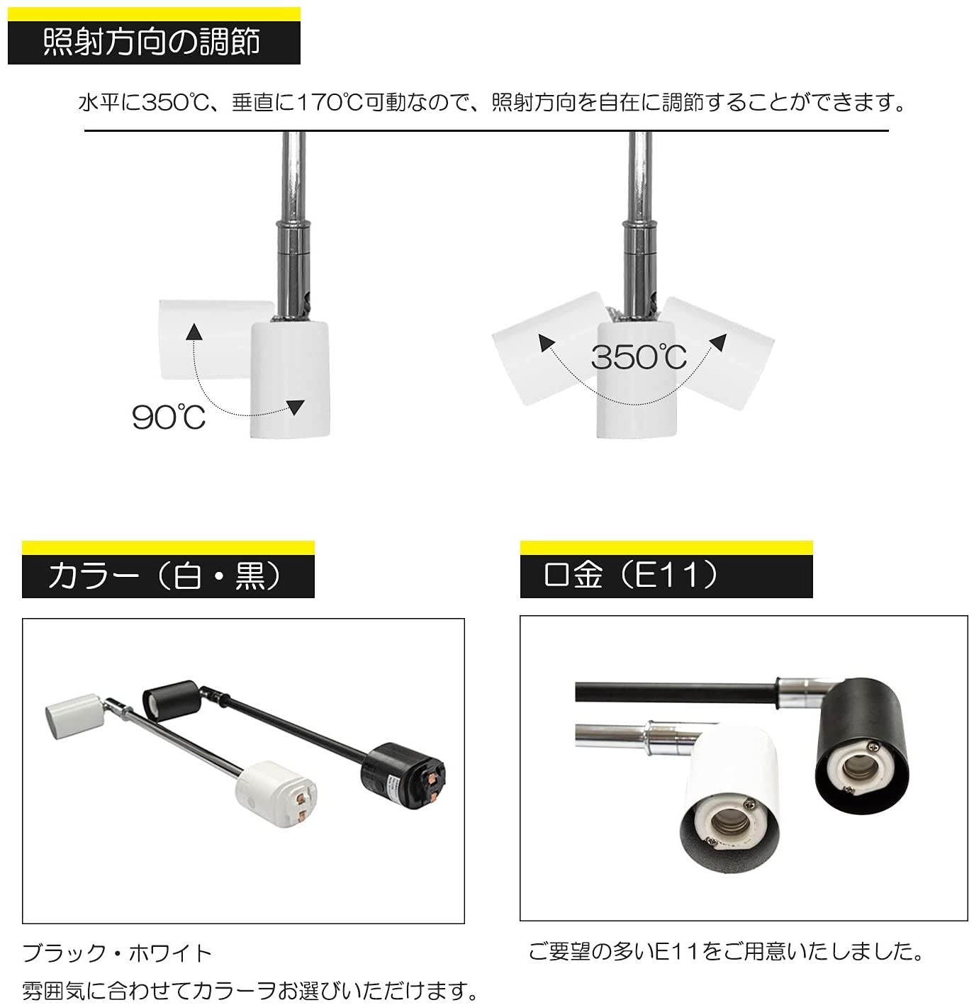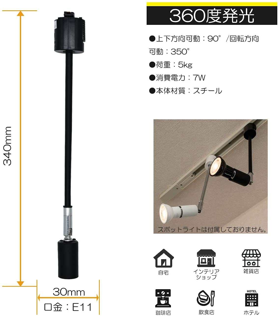 口金E11・E17・E26レールライト器具 スタンダードサイズ 口金E11・E17・E26 ロングサイズ(長さ:342mm) 口金E11・E17・E26 スーパーロング(500mm) 口金E11・E17・E26【SS期間限定】最安 ロングタイプ E11 黒 長アーム レールライト器具 ダクトレール用スポットライト器具 ロングタイプ ダクトレール用器具 LED対応 おしゃれ 照明器具 レールライト ライティングダクト ライティングレール器具 LED照明器具 間接照明 ※器具のみ 3,980円以上で送料無料 ♪ お部屋のインテリア・店舗照明・展示会など、様々な用途でご使用いただけます。 商品仕様 ○配線ダクトレール用スポットライト器具○口金:E11 E17 E26○電圧:AC125V○周波数:50/60Hz○サイズ:全長:340mm、最大径:30mm○荷重 :5kg○本体材質:スチール○安心日本PSE○RoHS規格準拠★曲げ角度を確保するには、200g以下の電球をご利用ください。 上下90°調節 左右350°回転 安心日本PSE 高難燃性規格 :V-0取得 一般家庭照明 演出照明 商業施設 店舗 商品展示用照明に 【自由に角度調整可】:左右は約300°、上下は約90°に回転可能なスポットライト。取付た後でもシーンやお好みに合わせて、照らしたい場所に自由に調整可能です。【取り付け簡単】:配線ダクトレールが設置してあれば、そのままダクトレールの溝に自由に配置できます。小さいなサイズでひとり暮らしの女性も簡単取り付け可能です。【インテリア照明】:スポットライトのように壁や絵などを照らして雰囲気のある空間をプロデュースできます。ダイニングテーブル上の照明としても素敵です。【シンプルなデザインで相性よい】:シェード無しスポットライトです、口金E11で、60Wまでの電球であれば、ランプ形状・大きさを気にする事なくご使用頂けます。【適用シーン幅広い】:ハロゲンタイプLED電球と組み合わせると、インテリアやモダンなリビングルーム、寝室、キッチンなど場所に適用するだけでなく、特殊な照明効果が必要なブティック、レストラン、カフェ、サロン、演出・商業施設・店舗展示場など様々なシーンで複数大活躍しています。【注意事項】・取付・取外しは必ず電源を切った状態で行なってください。・ランプはソケットに確実に取り付けてください。(※電球別売り)・リモコンタイプの照明器具は調光器に対応しておりません。・断熱材施工器具と密閉器具にはなるべく使用しないでください、使用寿命の減少の原因になります。・周囲温度が40℃を超える場所や腐蝕性環境では使用しないでください。・直流電源では使用しないでください。・点灯中・点灯直後は直接手でふれないでください。・水洗いや分解・改造はしないでください。水滴などがかかる場所では使用しないでください。・紙や布などでおおったり、燃えやすいものに近つけないでください。(火災、器具過熱の原因)・電源を入れた状態や電源を切った後しばらくの間は、ランプが熱いので触れないでください。(タケドの原因) 1