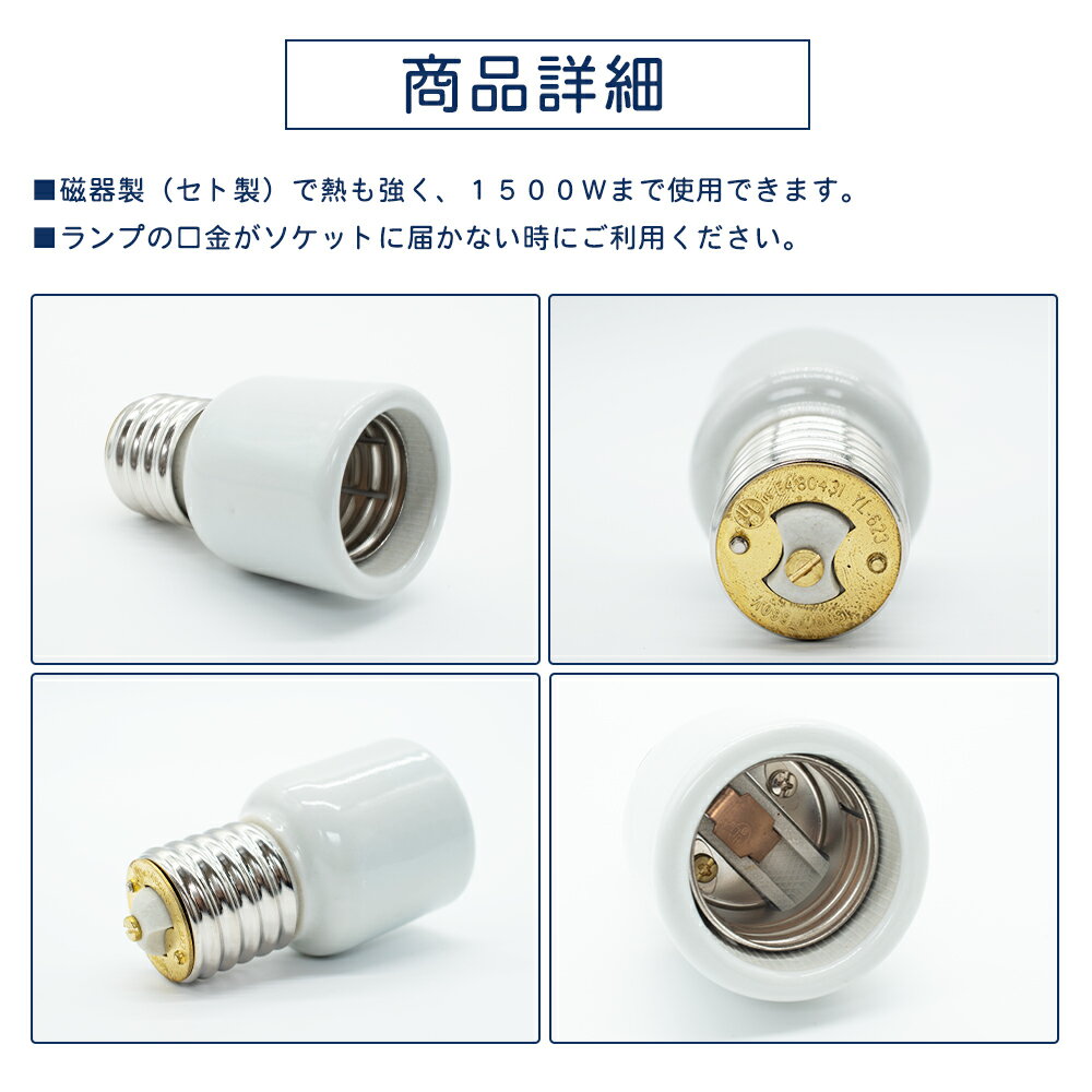■特徴 ●口金E39~口金E39の延長用アダプターです。 ●磁器製(セト製)で熱も強く、1500Wまで使用できます。 ●LED高天井灯や、セルフバラスト水銀灯代替えランプに使用出来ます。 ●メタルハライド電球、白熱灯、CFLおよびLED電球 E39ベースライトをE39ランプ電球ソケットに変換します。 ●PSE認証済み ●高温耐性、耐燃焼性および耐老化性、耐火性および耐侵食性 最大ワット数1500Wおよび電圧範囲0-660V 実用的で耐久性があり、設置が簡単 ●ランプの口金がソケットに届かない時にご利用ください。 ■ 商品仕様 口金延長アダプター(E39→E39) ●口金:ソケット側 E39口金 電球側 E39口金 ●サイズ:Φ56×102.5mm ●重量:(約)280g ●規格:高難燃性規格V-0 ●素材:陶器製 ■注意事項: 実物に近い色を画像で表現していますが、撮影環境、お使いのディスプレイなどの条件によって多少の誤差が生じる場合がございます。 商品のデザイン・仕様は改善のため、入荷のタイミングにより予告なく変更する場合がございます。ご了承ください。 LEDランプ用オプション・口金変換アダプター GX10q→E26(口金変換ソケット) GY10q→E26(口金変換ソケット) E39→E39(延長ソケット) E26(電球ソケット) E26→E17(口金変換ソケット) ライティングレール用プラグ ライティングレール用プラグ(黒) ライティングレール用プラグ(白) ライティングレール変換プラグ(黒/白)2個セット 口金E39~口金E39の延長用アダプターです。PSE認証済み ●メタルハライド電球、白熱灯、CFLおよびLED電球 E39ベースライトをE39ランプ電球ソケットに変換します ●高温耐性、耐燃焼性および耐老化性、耐火性および耐侵食性 最大ワット数1500Wおよび電圧範囲0-660V 実用的で耐久性があり、設置が簡単
