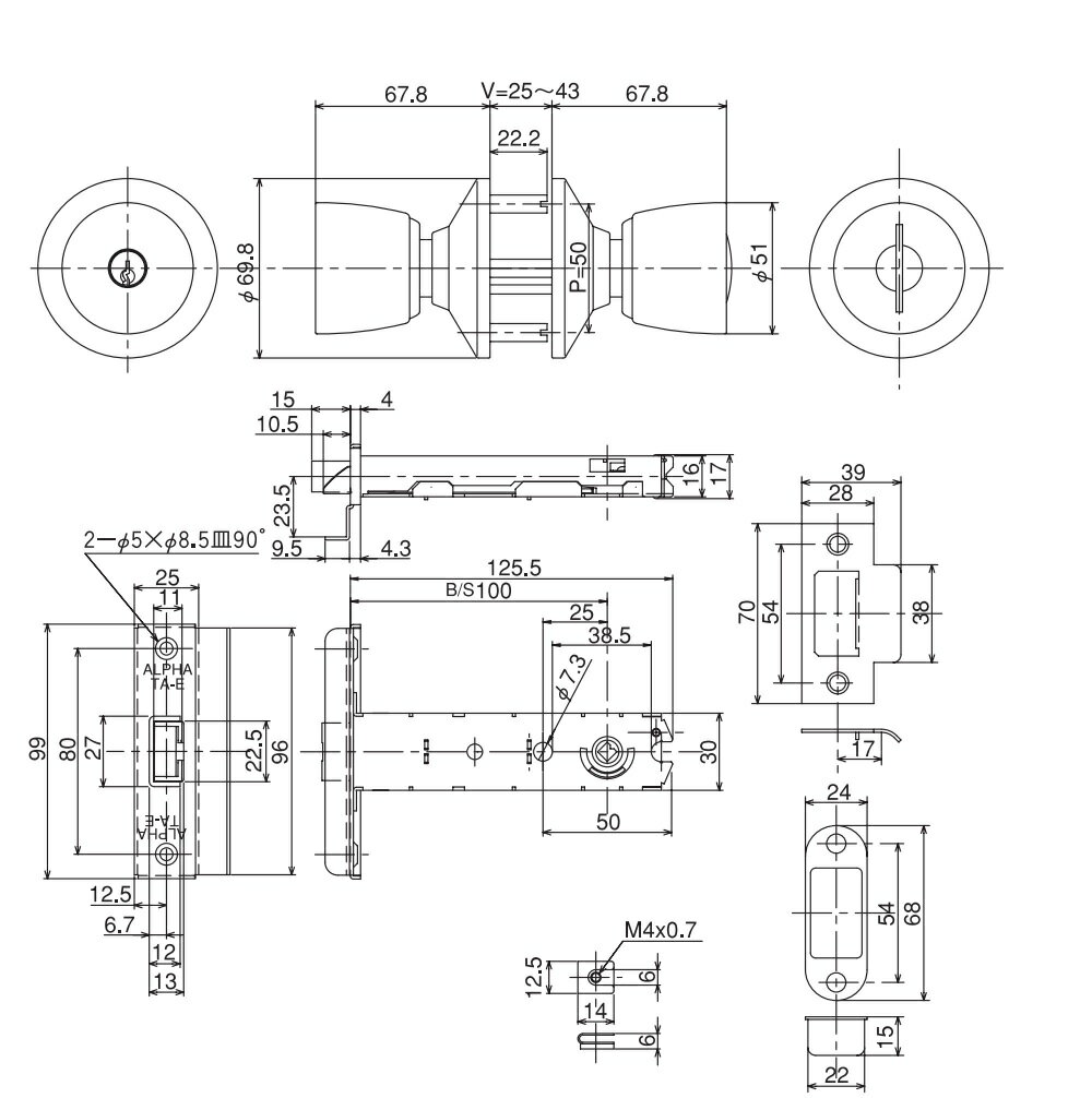 ALPHA ミリオンロック 33M05-TRW-32D-100-TO バックセット100mm 適合ドア厚25-43mmノブ取付ビスピッチ50mm専用