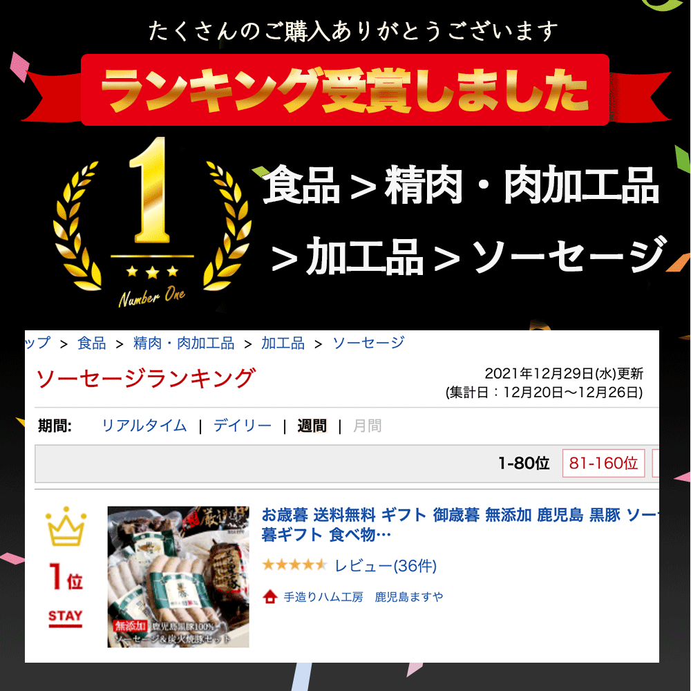 商品仕様 名称 鹿児島黒豚ソーセージ&炭火焼豚セット セット内容 ・黒豚スモークウインナー 100g(4本)・黒豚ホワイトウインナー100g(4本)・黒豚炭火焼豚 170g・豚珍かん(黒豚炭火焼) 120g 賞味期限 冷凍120日・冷蔵10日 配送温度帯 冷凍 保存方法 -18℃以下(冷凍)で保存して下さい。 原材料 【スモークウインナー】 豚肉(黒豚 鹿児島県産)、食塩、糖類(水飴・砂糖(洗双糖))、魚醤(さけを含む)、にんにく、香辛料、昆布粉末(北海道・羅臼産)【ホワイトウインナー】 豚肉(黒豚 鹿児島県産)、食塩、糖類(水飴・砂糖(洗双糖))、玉葱、香辛料、魚醤(さけを含む)、昆布粉末(北海道・羅臼産) 【焼豚】 豚肉(黒豚 鹿児島県産)、醤油(小麦・大豆を含む)、水飴、本みりん、昆布(北海道・羅臼産)、食塩 【黒豚炭火焼】 豚肉(黒豚 鹿児島県産)、醤油(小麦・大豆を含む)、水飴、本みりん、昆布(北海道・羅臼産)、食塩、にんにく、香辛料 アレルギー物質(28品目中) 小麦、大豆、豚肉、さけ 栄養成分表示(100g当たり)推定値 【スモークウインナー】 エネルギー:261kcal、たんぱく質:21.2g、脂質:17.2g、炭水化物:2.5g食塩相当量:1.6g 【ホワイトウインナー】 エネルギー:249kcal、たんぱく質:20.2g、脂質:16.4g、炭水化物:2.4g、食塩相当量:1.5g 【黒豚炭火焼】 エネルギー:201kcal、たんぱく質:15.7g、脂質:12.9g、炭水化物:3.5g、食塩相当量:1.6g 商品説明 原料の黒豚は「短鼻豚」。昔ながらの鼻が短い在来種により近い品種を厳選しています。 発色剤、結着剤、保存料、増量剤、化学調味料等、体によくないものは一切使用しておりません。全て無添加にこだわって製造しています。 ウインナーは、天然羊腸を使用しているため、不揃いな形です。スモークには桜のチップを使用しています。ボイルや、フライパンで軽く温めてお召し上がりください。 炭火焼豚は、羅臼昆布の旨みがたっぷり入った無添加醤油タレに漬込み、樫の炭でじっくり焼き上げました。 炭火焼も、特製タレに漬込み、樫の炭で焼き上げました。おつまみに、ご飯のおかずにおすすめです。 ※急速凍結し、【冷凍】でお届けします。 開封後はお早めにお召し上がりください。 鹿児島ますやの工場から直送でのお届けです。 解凍方法 冷蔵庫内でゆっくり解凍します。お急ぎの場合は、流水で解凍してください。 製造者 有限会社 鹿児島ますや鹿児島県姶良市西餅田303番1 鹿児島ますや人気No.1! ご自宅用・ギフトにもどうぞ ーーーーーーーーーーーーーーーーーーーー 鹿児島黒豚100%使用、無添加にこだわった、ソーセージと炭火焼のセットです。原材料にもとことんこだわり、熟練した職人たちが技術を駆使して、化学調味料を使わずに一つ一つ丁寧に手造りしています。子供からご年配の方まで無添加なので安心してお召し上がりいただけます。 こだわりの鹿児島黒豚 お肉は鹿児島ますやブランド黒豚「短鼻豚(たんびとん)」を使用。在来種にできるだけ近い品種の鹿児島黒豚です。 鹿児島黒豚は脂(白身)が多いのが特徴ですが、サツマイモを食べて育っているため、その脂こそが重くなく甘くてさっぱりとしています。重くないのでいくらでも食べられると評判をいただいております。 無添加へのこだわり 無添加の加工食品を作り始めたのは自分の子供がアトピーや喘息で苦しみ、医師からの「食べ物をかえなさい」の一言がきっかけでした。何の疑いもなく学んできた薬品や化学調味料による食中毒防止、旨味、色彩の効果が子供の病気の原因であると知ったとき、安心安全で食べる人の健康を考える食品を作ろうと決意しました。 嬉しいレビューのお言葉ありがとうございます! (抜粋して紹介させていただきます) ●喜んでもらえた 友人へのプレゼントで購入しました。普段から添加物を取らないようにしていてソーセージ、ハムは好きだけど食べない方なので、この無添加ソーセージはとても喜んでもらえて、美味しかったと好評でした。プレゼントに選んで良かったです。 ●暮れに友人へ贈り物にしました。冷凍タイプだったので、食べる期間の調整がきき、お正月などに重宝だった様子です^ー^ ●贈り物に最適 贈り物にしました。先方からとてもおいしかったとの連絡がありました。ありがとうございました。 ●とても美味しい とても美味しかったです。炭焼き焼き豚好きです。ソーセージもお肉の美味しさがよく感じられる。 添加物が無いのがとても良いです! ★ギフトサービス対応 各種のし・のし記名可 商品ページ「のし」からお選びください。その他の希望は備考欄へご記載ください。 金額のわかるものは同梱致しません。 冷凍でのお届けです 季節のギフトとして お歳暮 御歳暮 お歳暮ギフト 御歳暮ギフト お中元 御中元 お中元ギフト 御中元ギフト 夏ギフト 冬ギフト 帰歳暮 帰省暮 帰省土産 お年賀 御年賀 年賀 お年始 御年始 年始挨拶 年末 年始 大晦日 正月 母の日 母の日ギフト 花以外 父の日 父の日ギフト 敬老の日 おせち お節 御節 クリスマス 初節句 七五三 寒中見舞い 