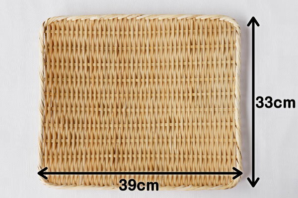 商品詳細 企画デザイン/かごや 作製/自社工房(中国) 素材/中国 ※手作り品のためサイズは多少異なります。 関連するカテゴリー ざる→ ▲ページトップへ特選 角盆ざる(約33×39cm) 竹ざる 水切りざる 熱に強くとても丈夫なので台所にかかせなくなるシンプルな角盆ざるです。ふだん使いはもちろん、野菜を干したり、洗った食器の水切りにしたり。いろいろ使えます。 ひごが厚く、硬くしっかり作られています。角盆ざるは、さまざまな用途に使用されるため、重さや衝撃(水を切るときにざる自体をたたいたりもします)に耐えられるようフチには太めのステンレス線が入っています。 竹を使用して作られているので、水の膜が出来にくく水切れがよいです。麺類を食べている間も竹が余分な水気を吸ってくれます。 サイズは約12×18cmのものから約36×42cmのものまで。野菜を干したり、洗った食器の水切りのほかにも、小さいサイズはお蕎麦やお菓子を盛リ付けなど、用途に合わせてお選びください。 おかげさまで楽天ランキングに入賞しました。