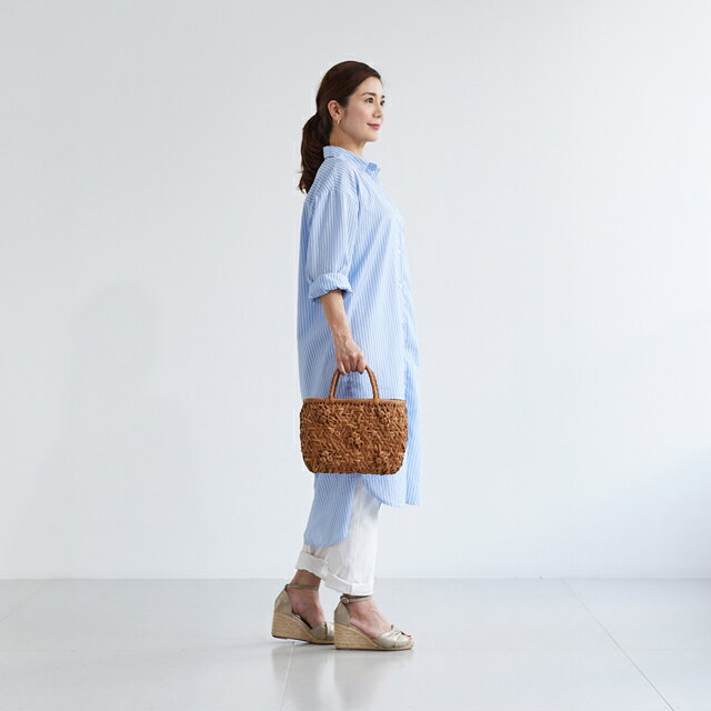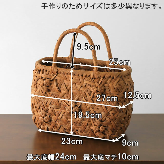 商品詳細 企画デザイン/かごや 作製/自社工房(中国) 素材/やまぶどう(中国) ※自然素材を使った手作り品のためサイズや色合いは多少異なります。 関連するカテゴリー やまぶどうへ→ 花編みへ→ 小サイズへ→ ▲ページトップへお花が咲いた♪ やまぶどう籠(二番皮/花五輪/みだれ編み/まんまるやさしい/小サイズ) 大人可愛いかごバッグ 小ぶりで可愛らしいかごバッグです。「みだれ」+「花」の甘すぎないデザインが、大人コーデによく合います。 小柄な方にも合わせやすく、使いやすい小さめサイズ 小柄な方にもバランスよく持っていただけるサイズです。また、必需品プラスαが入るので、普段使いに重宝します。 [容量の目安]長財布、携帯電話、ハンカチ、ポーチ、330mlペットボトル、折りたたみ傘が入っています。 つややかで明るい皮肌 つややかで明るい風合いの二番皮(一番皮を削いでやまぶどうの樹皮液に浸け磨き上げた皮)を使用。皮の風合いが均一で、整っています。磨きあげられている分、一番(定番の)皮に比べるとゆっくりとツヤが増します。 丸みのあるやさしいフォルムです。 ふちは、八の字編み。丈夫で見た目がよいです。 シンプルな立ち取手。すっきりとした印象になります。巻きの中に一本ひごが入り、ゆるみにくい作りになっています。 底部分も丁寧に編まれています。ひごに小さな穴があいておりますが、くぎで木型に固定したときのものです。予めご了承ください。 おかげさまで楽天ランキングに入賞しました。