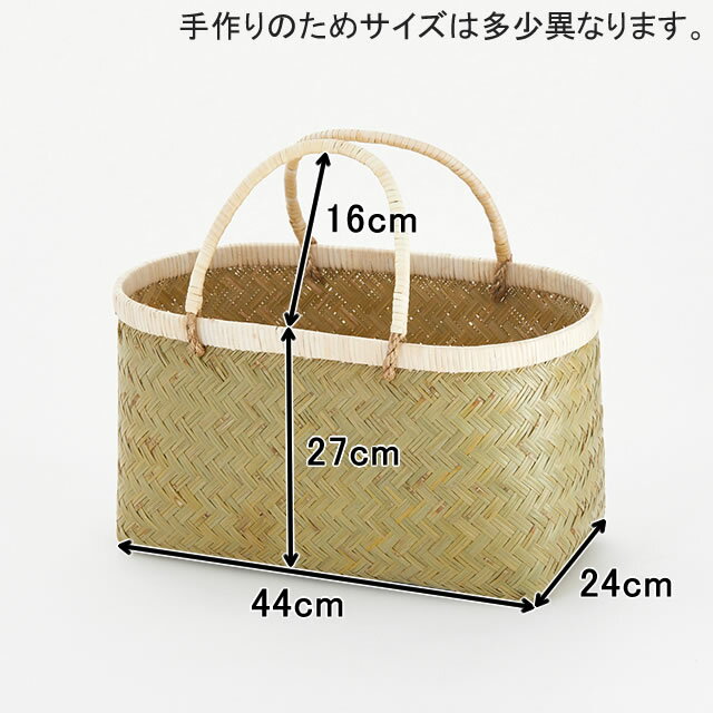 関連するカテゴリー 竹かごへ→ 特大サイズへ→ インテリアへ→ ▲ページトップへ特選 青竹市場かご(楕円/籐取手/大サイズ) お買い物や収納グッズとして大活躍 料理のプロが愛用している市場かごです。スーパーでのお買い物はもちろん、ナチュラルで可愛い見た目から、インテリアや収納グッズとしても活躍してくれます。 たっぷりと口が広いので、キッチンでは野菜入れとして、リビングでは、本やひざ掛けを入れたり、子供のおもちゃ箱にしたりと、使い方はさまざま。 通気性が良いので、食材が痛みにくい 竹ひごで編まれたかごは、通気性がよいので、食材の鮮度を落としにくく、保存の際も野菜が長持ちします。マチも広く、食材をあまり重ねずに入れられますし、ほどよい弾力性があるので、持ち運びのとき、食材を衝撃から守ってくれます。 よりナチュラルな雰囲気に ふちと取手には、籐を使用しています。ナチュラルで優しい風合いはお部屋にもなじみ、おしゃれな雰囲気を演出します。 底面には、しっかりとした補強(力竹)が入っています。 竹は環境にやさしいエコ素材 竹は、とても成長が早い植物です。生命力にあふれ1日に1m以上も伸びることも。毎年種をまくこともなく、農薬を使う必要もありません。伐ってもどんどん生えてくる竹は、資源を減らすことなく活用できる究極のエコロジー素材です。 熟練の職人が丁寧に編み上げています 切りそろえたひごを、木型を使わず、定規で測りながら編み上げていきます。特に細いひごは、ちょっとした力加減で割れてしまうので細心の注意が必要。ひごの感触を確かめながらの作業は、高度で繊細な技が要求されます。 おかげさまで楽天ランキングに入賞しました。 お客様に知っておいていただきたいこと 商品の色味について 自然素材の竹を手編みしている商品ですので、製作時期や育った環境により色合いが異なる場合がございます。竹の青い色も、時間の経過とともに段々と色が抜け、まろやかな黄色に変化していきます。 表情豊かな自然素材 性質上ひごに、黒いシミ・節・ムラ・剥がれ・割れなどがございます。自然の証としてご理解ください。使い込むことにより、皮の剥がれや白い部分などは、色が馴染み風合いが増してゆきます。 上記の写真のような場合がございます。予めご了承ください。 あたたかみある手作り品 当店のかごは、ひとつひとつ職人が手編みしておりますので、サイズに若干の違い・ゆがみ・隙間がございます。 縫製について 申し訳ございませんが、巾着や内布などの縫製加工は承れません。