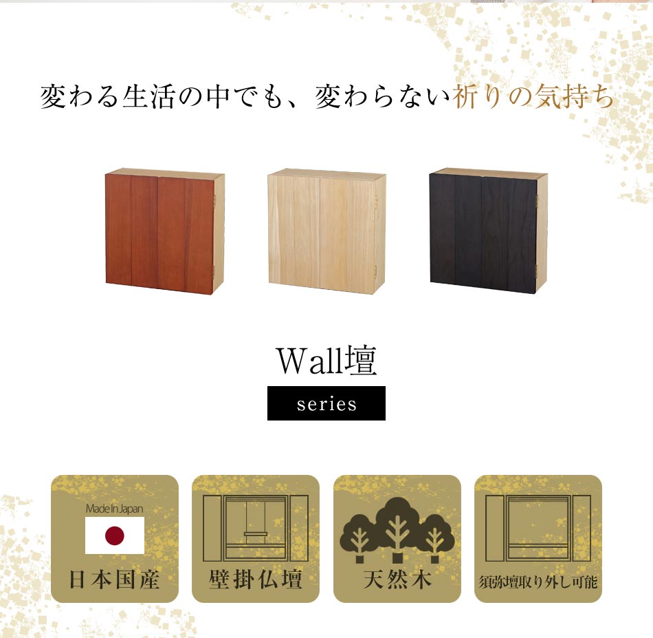 サイズ 幅40cm×奥行18cm×高さ40cm 材質 本体/戸板:無垢(栓) 塗装/ウレタン塗装 仕様 完成品 原産国:日本(静岡) 配送につきまして 商品の配送は全て宅配便(1人)での玄関渡しとなります。集合住宅の場合はエントランス渡しになります。重量商品の為、お客様にお手伝いをお願いする場合がございます。またはエレベーター無し2階以上などの場合別途送料が発生する可能性がございます。※どうしてもお手伝いが難しい場合は、備考欄に手伝い不可の為、開梱・設置便希望との旨をご記載下さい。弊社にて開梱・設置便の見積もりを取り、再度ご連絡を差し上げます。 【こんな方に選ばれています】 小学生 中学生 高校生 大学生 大人 一人暮らし 1人暮らし 2人暮らし 二人暮らし 兄弟 姉妹 男性 女性 女の子 男の子 男 女 単身赴任 社会人 成人 成人男性 成人女性 ルームシェア 共同生活 シェアルーム おじいちゃん おばあちゃん 祖父 祖母 曾祖母 曾祖父 10代 20代 30代 40代 50代 60代 70代 80代 【特徴】 壁に掛けることで、床にスペースを取らず、限られたスペースでも仏壇を置くことができます。 特にマンションやアパートなど、広さが限られている場所で便利です。 ペットや小さな子供がいる家庭では、仏壇に触れたり倒したりするリスクが減ります。 壁に取り付けるため、安定性が高いです。 また、座った状態や立った状態でも無理なく手を合わせることができます。 【質感と性能】 壁掛け仏壇 壁壇 WALL壇 仏壇 ミニ仏壇 壁 省スペース仏壇 須弥壇 膳引 天然木 木製 木 軽い 軽量 壁用 壁専用 取り付け金具付き 壁美人 金具付き 推し祭壇 祭壇 推し活 本格祭壇 神道 仏教 浄土宗 天台宗 真言宗 曹洞宗 臨済宗 日蓮宗 【こんな空間におすすめです】 和モダン モダン 和風 アパート マンション 傷を付けたくない 省スペースで使いたい モダンなお仏壇が欲しい