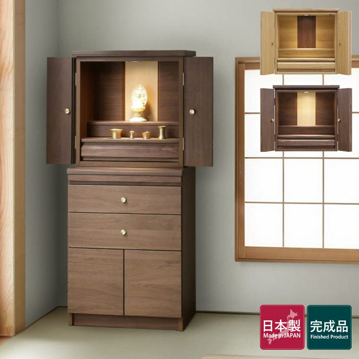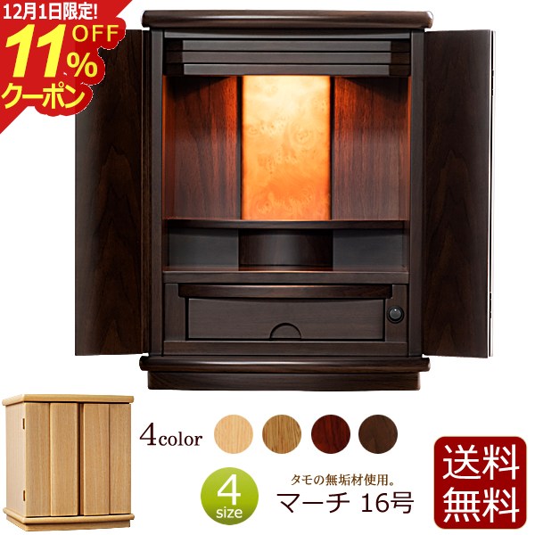 商品サイズ スリムタイプ:幅21×奥行21×高さ30(cm) ワイドタイプ:幅30×奥行21×高さ21.3(cm) ※仏壇内部の棚は可動式となります。 材質 天然木(桐) 塗装:ウレタン樹脂塗装 仕様 完成品 仏具は付属しません。 ※木製品の特性について 材質において木目や製品の仕上がりには必ずバラつきが生じますこと、手彫りや塗装など手作業の端部は職人の技量等により仕上げムラ等がございますこと、予めご承知おき下さいませ。 お求めやすい価格を実現するため、通常のご使用において見えない部分や見えにくい箇所につきましては、表面材としては使用しない材料を用いコストダウンを図っております。 製品は、工場から完全梱包の状態で出荷されますが、輸入商品ということもございまして長距離輸送の間に梱包材との摩擦等によって僅かな擦り痕等がついてしまうこともございます。 上記のとおり、色ムラや木材の節目へこみ擦り痕や傷等は必ずあるものとお考え下さい。 交換返品などご要望いただいた場合も、当店にて通常にご使用いただくうえで問題がないと判断させていただきました場合はご対応はいたしかねます。 恐れ入りますが予めご了承下さいませ。 必ずお読みください。 ※商品撮影時の撮影機材、ご使用のPC環境によって商品の色が実際の色と多少異なる場合がございます。 ご了承ください。 ※ 製造上または製品改良のため、予告なく仕様変更する場合がございますのでご了承下さい。