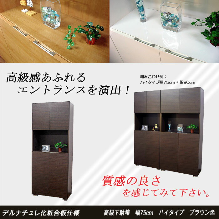 ※ブラウンとナチュラルは、鏡面仕上げではなく、美しい木目(デルナチュレ仕様)になっております。※ホワイトは、鏡面仕上げで光沢はありますが、木目ではなく単色です。 ◎こちらのページは幅75(ハイタイプ)の販売ページです。 ●幅90センチタイプはこちら ※この商品はお客様組立式です。 ※お届けは、玄関先までとなります。 ※この商品は大型サイズのため配達時間指定/夜間配達指定はできません。 (配達伝票には希望時間帯を記載いたしますが確約はできません) ※ご注文日より7営業日以降のお届け日のご指定が可能ですが、 運送会社の荷物量や交通事情等でお届け指定日に届かない場合もございます。 ※お届け日指定で出荷してもご指定日通りお届けできない地域や場合がございます。 ※配達当日の再配達ができない地域や場合がございます。 ※日曜・祝日の配達および再配達ができない地域がございます。(詳しくはお問合せ下さい) ■送料無料(北海道・沖縄・離島を除く) ◆北海道の送料:3800円 ◆沖縄・離島の送料:4800円 ※全国の離島の送料はご注文前にお問い合わせください。※一部の地域では配達できない場合がございます。 ※送料に変更がある場合はご注文後、当社(家具ファクトリー)からのメールにおいて、金額変更のうえご連絡いたします。 ◎こちらのページは幅75(ハイタイプ)の販売ページです。【日本製】 商品説明高さは、約187cmとハイタイプなので収納力抜群です!!奥行は、約36.2cm(内寸:約32.5cm)だから大き目の靴も収納でき、圧迫感もあまり感じさせない適度な大きさになっております。(最大約30足収納)また、単なる収納スペースとしてだけでなく、中央部にオープンスペースを設けることで、花や小物を飾ることにより、最初にお客様をお迎えする玄関スペースを自分だけのオリジナルスペースでおもてなしすることができます。(オープン部の高さ:42.5cm)下段の扉には、埋め込みタイプの引き手がついており、アクセントとしても高級感を演出しております。(上段の扉には、引き手は付いておりません。)また、脚(プラパート)を付けることにより、直接本体が地面に接しないので、湿気づきにくいです。可動棚は、PVC素材だから汚れても洗えて清潔です。(可動棚の奥行29cm)※商品の天板上面は化粧されておりません。 商品に対する当工場のこだわり(他社と違うところ)●扉の前面にデルナチュレ化粧合板を使っており、限りなく天然木に近く、キズや化粧はがれや汚れに強く、耐久性に優れております。●LAMP社の高級スライド丁番を使用。ワンタッチで取り付けでき、通常のスライド丁番のように左右に微調整ができるだけでなく、上下にも微調整できます。これによって、扉の微妙な立付け具合を簡単に調整できます。 価格37800円(送料無料:北海道・沖縄・離島を除く)この商品は、完全ネットオリジナル商品です。(アウトレットではございません。) サイズ約幅750奥行362(扉の厚み含む)(有効奥行内寸 : 325)高さ1870可動棚(大):幅460奥行290可動棚(小):幅230奥行290 ◎こちらのページは幅75(ハイタイプ)の販売ページです。 材質扉の前面・オープン部の棚上面:デルナチュレ化粧合板(同タイプの安い商品と違い、風合いがあり、キズがつきにくく、耐久性に優れております。)その他主材:プリント化粧合板(プリント化粧繊維板のように反ったり、カビがはえたりしにくい)引き手:プラスチック樹脂製(上段の扉には付いておりません)脚(プラパート):プラスチック樹脂製。可動棚:PVC素材(汚れても水で洗えます。)当方の家具はすべて、安心してお使えできる低ホルマリンの接着剤を使用しております。 カラーホワイト(鏡面仕上げ・単色):光沢があり、明るく清潔感・高級感のある色。(真っ白ではございません。)ブラウン(デルナチュレ仕様・木目):落ち着いた高級感のある焦げ茶色。ナチュラル(デルナチュレ仕様・木目):やわらかな赤みの黄色です。※ブラウンとナチュラルは、鏡面仕上げではなく、美しい木目(デルナチュレ仕様)になっております。※ホワイトは、鏡面仕上げですが、木目ではなく単色です。 その他お客様組立式、固定棚2枚、可動棚(大)8枚(奥行290)、可動棚(小)8枚(奥行290)転倒防止バンド付き、日本製※商品の天板上面は化粧されておりません。 梱包サイズ(約cm)&重量(約kg)2梱包 約98×43×20cm / 約92×51×17 用途・コンセプト・キーワード下駄箱 シューズボックス 玄関収納 スリッパ収納 靴箱 多目的棚 キャビネット 収納庫 収納 棚 デザイナーズ 北欧 グッドデザイン シンプルモダン 通販 通信販売 茶(こげ茶系) 白 ナチュラル おしゃれ デルナチュレ化粧合板(天然木風合い仕上)とは? お支払い・送料について