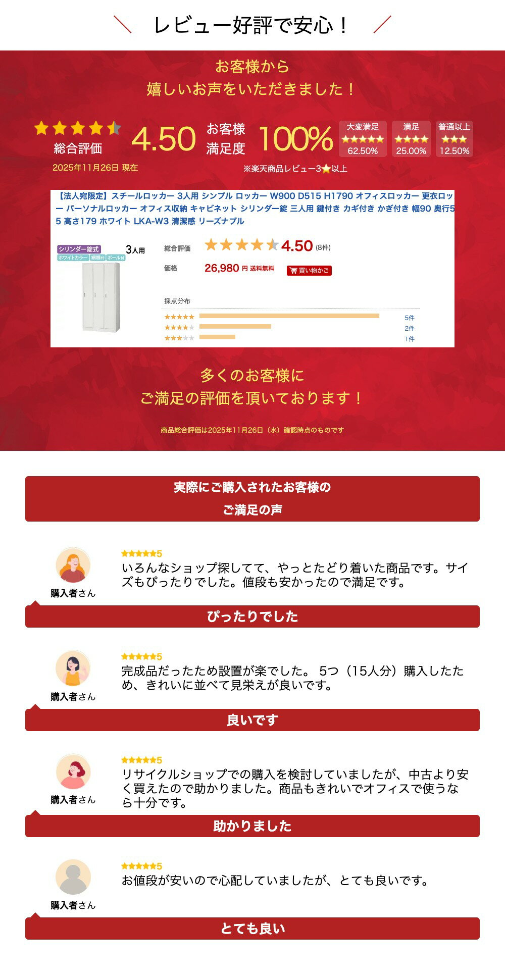 商品説明 ●明るく清潔感のあるホワイト色のエコ塗装を施した、大変リーズナブルな3人用スチールロッカーです。 ●オフィス用ロッカーの機能を最小限に絞り込むことで、この価格帯を実現しました。 ●他にも、1人から12人用まで豊富なサイズ展開で取り揃えております。 ●社員やスタッフの方々の人数や、スペースに応じてお選びください。 ●また、明るく清潔感のあるホワイトカラーを採用しておりますので、極力コストを抑えた形でのホワイトオフィスのコーディネートの際にも最適なオフィスロッカーと言えるでしょう。 ●他にも、 1人用、 1人用ワイドタイプ、 2人用、 2人用ワイドタイプ、 2段2人用、 4人用、 2段4人用、 2段4人用ワイドタイプ 6人用、 8人用、 4段8人用、 9人用、 12人用と取り揃えておりますので、社員やスタッフの方々の人数や、スペースに応じてお選びいただけます。 商品情報 ■サイズW900×D515×H1790mm ■重量44kg ■耐荷重ハンガーパイプ:20kg網棚:10kg ■梱包サイズW920×D545×H1800mm ■梱包重量45kg ■カラーホワイト ■材質本体・扉:スチール製、粉体塗装取手:ABS樹脂 ■認定SIAA抗菌加工登録商品 ■付属品ハンガーパイプ、Sカン、樹脂網棚(上下各1箇所)、鏡、ネクタイ・タオル掛け、傘立、雫受 ■組立有無無し(完成品) ■配送エレベーターなしの場合、別途階段上げ料が発生します。ただし、配送時の状況により、エレベーターがあっても、駐車やワンマン配送の影響で、1階でのお渡しになる可能性があります。また、配送の時間指定はできませんので、予めご了承ください。 ■設置配送は基本的に軒先渡しです(荷卸しでお手伝いいただくこともございます)。商品の設置はお客様自身で行っていただきますが、現場で設置をさせていただくサービス(有料)もございます。ご希望の場合は、ご依頼の際にお問い合わせください。なお、設置サービスをご利用の際の納品日は、東京23区内で1週間程〜、その他の地域で3週間程〜いただいております。大型商品の為、設置場所までの搬入経路(エレベーターや戸口サイズ)をご確認の上、お買い求めください。また、お客様のご不在等でお受け取りいただけなかった場合は、再配達費用が発生致しますので、ご注意ください。一部のエリアは車上渡しになります。 ■納期目安北海道・東北・関東・中部・近畿・中国・四国・九州:7〜10日程度、沖縄:3〜4週間程度となっております。 ■備考2024年9月一部仕様変更がありました。 設置スペースを明るくするホワイト色の塗装を施した、コストパフォーマンスの高いロッカーです。 他にも、1人用から12人用とバリエーション豊富に取り揃えております。 開けやすい形状 自然と握りやすく、使いやすいデザインを採用したロッカーの取っ手は、細部にまでこだわった、どなたでも開けやすい形状となっております。 開閉表示付き 鍵穴の向きにより、施錠と解錠の状態が一目で確認できる開閉表示付きの錠前は、キーの掛け忘れ防止にも役立つ便利な機能となっております。 戸当りクッション スチール特有の金属音をやわらげるため、また商品をキズつけず長持ちさせるため、扉裏の上下部分に戸当りクッションを採用しています。 ラッチ付き取っ手 ロッカー扉の取っ手はラッチ付きです。外部からのこじ開けに強い、カマ錠を採用してあります。 リバーシブルキー 付属のカギは、差し込みやすいリバーシブルキーとなります。1扉につき、2本のキーが付いています。 ハンガーパイプ もちろん、コートやスーツ等の上着を掛けるのに欠かせない、ハンガーパイプを標準装備しています。 詳細外寸法 関連キーワード:明 清潔感 ホワイト色 エコ塗装 施 大変リーズナブル 人用スチールロッカー オフィス用ロッカー 機能 最小限 絞 込 価格帯 実現 他 人 人用 豊富 サイズ展開 取 揃 社員 スタッフ 方 人数 スペース 応 選 ホワイトカラー 採用 極力コスト 抑 形 ホワイトオフィス コーディネート 際 最適 オフィスロッカー 言 設置スペース 塗装 コストパフォーマンス 高 ロッカー オフィス家具 オフィス用 事務所用 カギ付き 鍵 オフィス収納家具 更衣室 更衣室ロッカー 荷物入れ 施設 役場 役所 学校関連商品【法人宛限定】スチールロッカー 6人用 シンプル ロッカー W900 ...【法人宛限定】スチールロッカー 4人用 シンプル ロッカー 1段型 W...【法人宛限定】スチールロッカー 4人用 シンプル ロッカー 2段型 W...33,980円31,480円28,780円関連ワード: 法人 キャビネット 法人用 キャビネット 人用ロッカー 法人 オフィスキャビネット スチールロッカー 3人用 シンプル ロッカー W900 D515 H1790 オフィスロッカー 更衣ロッカー パーソナルロッカー オフィス収納 三人用 鍵付き カギ付き かぎ付き 幅90 奥行51.5 高さ179 ホワイト 清潔感 エコ塗装 リーズナブル スチール製ロッカー オフィス用ロッカー 機能的 社員 スタッフ ホワイトカラー オフィス家具 事務所用 更衣室 施設 役場 役所 学校 オフィスストレージ 3人分 3人対応 棚 ハンガーパイプ 