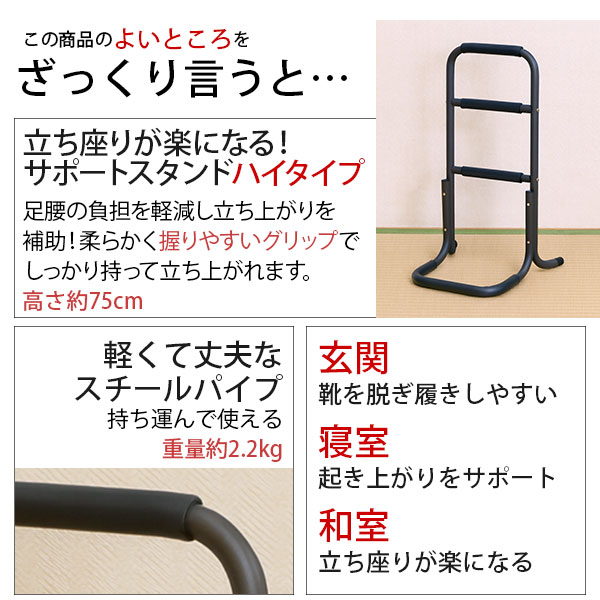 類似商品はこちら2個セット らくらく立ち上がり手すり サポー8,913円玄関 踏み台 1段 手すり付き 74幅 ステッ7,980円玄関 踏み台 1段 90幅 完成品 ステップ台7,990円玄関 踏み台 1段 60幅 完成品 ステップ台6,980円玄関 踏み台 1段 45幅 完成品 ステップ台6,490円4脚セット 正座椅子 背もたれ付き 座面高さ111,980円正座椅子 背もたれ付き 座面高さ18cm 完成3,990円スチールラック 3段 75幅 おしゃれなヴィン6,480円スチールラック 3段 75幅 スリム おしゃれ5,880円新着商品はこちら2025/12/25国産ひのき すのこ 押し入れすのこ 60×302,780円2025/12/25国産ひのき すのこ 押し入れすのこ 60×382,980円2025/12/252個セット 国産ひのき すのこ 押し入れすのこ3,980円再販商品はこちら2025/12/263分別 ゴミ箱 スリム フタ付き 70L 幅219,038円2025/12/26バーチェア カウンターチェア 低め キャスター13,927円2025/12/26スチール チェスト 7段 キャスター付き A410,069円立ち上がりをサポート 高さ75cmサポートスタンド の説明 腰や足の負担を軽減!立ち上がりをサポート! サポートスタンド 簡単組立 耐荷重約50kg 手すり3段階 高さ75cm ハイタイプ この商品のよいところをざっくり言うと… 立ち座りが楽になる! サポートスタンドハイタイプ 足腰の負担を軽減し立ち上がりを補助! 柔らかく握りやすいグリップでしっかり持って立ち上がれます。 高さ約75cm 軽くて丈夫なスチールパイプ 持ち運んで使える 重量約2.2kg 玄関 靴を脱ぎ履きしやすい 寝室 起き上がりをサポート 和室 立ち座りが楽になる 3段階の持ち手で 立ち上がりをサポート 椅子からの立ち上がりや寝た状態からの起き上がり 床に座った姿勢からの立ち座りをスムーズにサポート! 3段階の持ち手部分で無理なく立ち上がりを助けてくれます。 適度な重さと安定感! ペットボトル約1.2本分の重さ 重さ約2.2kg 2リットル入りのペットボトル約1.2本分。 軽くて丈夫なスチールパイプ製で安定感と片手でも持ち運べる軽さがポイント! 使いたい場所に気軽に持ち運べます。 こんな場所で大活躍! 玄関 靴の脱ぎ履き 和室 床の立ち座り 寝室 起き上がり ダイニング椅子の補助 プラスドライバーで簡単組立 こちらはお客様に組立てていただく商品です。 組立てにはプラスドライバーをご用意ください。 手すり部、脚部をプラスドライバーで4ヶ所取り付けます。 ナット、ボルトの入れる向きに注意し、ボルトは一度にきつく締めず仮止めで全体のバランスをみて、歪みを調整しながら締めます。 握りやすいグリップ 床の滑り止め キズ防止キャップ 外寸(約):幅43×奥行39×高さ75cm 持ち手幅(約):32cm 内寸高さ1段目(約):31.8cm 内寸高さ2段目(約):55.3cm 耐荷重(約):50kg 製品重量(約):2.2kg 梱包重量(約):3.34kg 主材:スチールパイプ、粉体塗装、EVE(グリップ) 備考:組立式(六角レンチ付属)、ツヤ無し(マット) 「この商品のココがすごい!!」 立ち上がりをサポートする手すり 足腰の負担を軽減し、辛い立ち上がりをサポート! 高さ約75cm 椅子やベッドからの立ち座りに便利なハイタイプ 3段階の手すり 柔らかく握りやすいグリップで3段階にしっかり持てる 重さ約2.2kg 軽くて丈夫なスチール製で持ち運んで使える 玄関・寝室・和室・トイレ 靴の脱ぎ履き、寝室の起き上がり、椅子の立ち上がりに便利 簡単組立 お手持ちのプラスドライバーで簡単に組み立て可能 商品名:手すり 立ち上がり補助 高さ75cm サポートスタンド 幅43cm 奥行39cm 自立型手すり 3段 介護 立ち上がり 補助器具 グレー おしゃれ 玄関 手摺 置くだけ ベッド横 つかまり立ち 高齢者 転倒防止 滑り止め付き 歩行補助 丈夫 軽い スチール コンパクト 組み立て簡単 SSEC-75 インテリア 介護用品 福祉用具 立ち上がり補助器具 立ち座りサポート リハビリ 補助具 自立式 置き型 立ち座りしやすい しっかり支える 足腰の負担を軽減する ベッドサイド 新生活 一人暮らし ワンルーム リビング 居間 ダイニング 和室 トイレ ソファ横 ソファサイド 布団横 寝室 ベッドルーム シンプル モダン シニア 老人 持ち運びしやすい つかまりサポート プレゼント 贈り物 ギフト 敬老の日 父の日 母の日 立ち座りの動作を安全にサポート 立ち座り補助 立ち座りの際に体重をかけることができる 立ち上がりサポート用 洋室 身長や体勢に合わせて握る位置を選べる 膝や腰への負担を軽減 安定して立ち上がることができる しっかり握り込みやすい 組立簡単 設置場所を選ばない 持ち運びもラクラク 高齢の方 介護が必要な方 床座りの多いご家庭 ベッドや布団からの起き上がり 椅子やソファからの立ち上がり 日常生活のあらゆるシーンで活躍 体重を預けてもしっかり支えてくれる 足元や床に優しい 床キズ対策 一般家庭用 ※この商品は、一般家庭用として作られておりますので、業務用など特殊な用途には使用しないで下さい。 ※この商品は、つらい立ち・座りの際に生じる足腰の負担を軽減する、立ち座り用の補助具です。 介護が必要な方や立ち座りが困難な方が一人で使用されると、思わぬ事故につながりますので、十分ご注意く