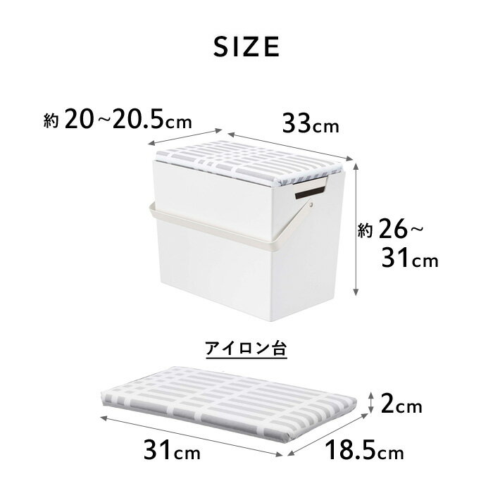 アイロン台とアイロン収納が1つになった便利なアイロン掛けできる蓋付きアイロン収納ケース。 ●送料無料です。 ●沖縄・離島は追加送料がかかります。注文確認後、送料修正しご案内いたします。北欧 暮らしの定番 アイロン掛けできる蓋付きアイロン収納ケース アイロン台とアイロン収納がひとつになった、便利な蓋付きアイロン収納ケース。 洋服の袖口や襟元など、ちょっとしたもののシワを伸ばしたい時に、蓋の上を使ってアイロン掛けが出来る優れものです。 収納ケースには、アイロン本体を収められるほか、 霧吹きや、スプレーなど高さのあるアイテムも収納することが出来ます。 優しい色合いのチェック柄ファブリックが北欧らしいアイロン台と、シンプルでスタイリッシュな収納ケースがセットになったおしゃれなアイテムです。 北欧風のファブリックが生活を飾る。 暮らしの定番になってくれるアイロン台。 山崎実業が創業より70年かけて追求し続けるアイロン台。日本の生活の中にあるアイロンがけという家事に「驚きと感動」、そして「アイデア」をプラスし、ライフスタイルを豊かに、快適にしてくれる暮らしの定番となるシリーズです。 使い心地はもちろん デザインにもこだわった 高品質なアイロンボード。 アイロン台としての使い心地、利便性、そして生活感のない美しいデザイン。「北欧風 暮らしの定番シリーズ」は、アイロン台としての品質はもちろん、見た目やディテールにまでこだわりをもってつくられています。 蓋の上でそのまま アイロン掛け。 収納ケースの蓋がそのままアイロン台に。 裁縫をした後や、洋服の袖口、襟元などちょっとしたアイロン掛けをしたい時、大きなアイロンボードを組み立てなくても、 蓋の上でそのままサッとアイロン掛けをすることができます。 ※ケースの上に置いてアイロン台をご使用の場合、スチーム機能は使用しないでください。透過したスチームが温度差によって湯滴となりトレーに付き錆の原因になります。 ハンドル付きで、 持ち運びもしやすく。 収納ケースには、持ち運びに便利なハンドル付き。 場所を移動したい時も、片手でサッと運べて便利です。ハンドルは左右どちらにも下げることが出来るので、邪魔になりません。 アイロンがすっぽり入る、 抜群の収納力。 収納ケースにはアイロン1台をそのまま収納することが出来ます。高さがあるので、アイロン以外にも霧吹きやスプレーなど背の高いアイテムも入れることができます。 ※収納ケースのみの販売です。アイロン、小物等は付属しておりません。 裁縫道具や、お名前シールなど、 小物を収める便利な仕切りトレー。 お子様の布かばんや洋服に付けるお名前シールや、アイロン掛けのときに使う当て布など、ちょっとした小物を仕分けて収めるトレーが付いています。 散らばりやすい小物も、一目でわかりスッキリ。 北欧風 暮らしの定番 おすすめアイロン台 ●商品の詳細● 品 名 北欧暮らしの定番 アイロン掛けできる蓋付きアイロン収納ケース サイズ 本体:約 幅33 × 奥行20.5~20 × 高さ26~31cm(ハンドル含む) ケース:約 幅32 × 奥行20 × 高さ24cm(ハンドル含まず) トレー:約 幅31 × 奥行19 × 高さ1.7cm アイロン台:約 幅31 × 奥行18.5 × 高さ2cm 内 寸 ケース:約 幅31(底面:28)× 奥行18(底面:16) × 高さ21.5cm トレー:(半面)約 幅15 × 奥行15.5 × 高さ1.5cm 重 量 約 1640g 耐熱温度 ケース:約 90℃ 耐荷重 約 2kg 材 質 ケース:ABS樹脂 ハンドル:スチール(粉体塗装) トレー:スチール(粉体塗装) アイロン台:(表面布/綿 クッション材/ポリエステル)天板:木質繊維板 カラー チェックグレー 入 数 1個 備 考 収納ケースのみの販売となります。アイロン、小物は付属しておりません。 ■注意点 【ケースの上に置いてアイロン台をご使用の場合】 ※スチーム機能は使用しないでください。透過したスチームが温度差によって湯滴となりトレーに付き錆の原因になります。 【アイロン台のみでご使用の場合】※テーブルやじゅうたん等の上では床面にタオルなどをひいてからご使用ください。(変形・変色・キズ・滑り防止のため。)※裏紙が濡れているとテーブルやじゅうたん等に貼りつき、破損や汚れの原因となります。 【共通】 ※収納するもののサイズや形状によっては収納できないものがございます。 ※アイロンの電源を切り、コンセントは必ず外してから収納してください。 ※アイロンを熱いうちに収納すると、熱でコードやケースを傷つける恐れがありますので、念のため5分以上放置して熱を冷ましてから収納してください。 ※耐荷重を超える使い方はしないでください。 ※当初、万一多少臭いを発することがありましても、ご心配はいりませんが、その際は蓋などを開けて2~3回仕様されますと自然に消滅いたします。 ※商品の色は、画像と実物とでは多少異なる場合がございます。色・イメージが違う等の理由による返品は一切お受けできません。予めご了承下さい。