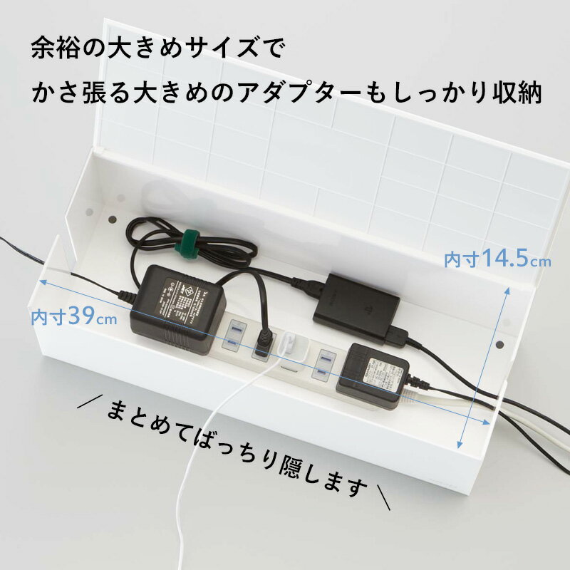 見苦しいケーブルタップ周りをスッキリ収納できる上質なケーブルボックス。 ケーブル類をまとめてボックスの中に収納することで、ホコリがたまりにくく電源火災の予防にもなります。7個口の電源タップが収納できます。 ●沖縄・離島は追加送料がかかります。注文確認後、送料修正しご案内いたします。山崎実業 ケーブルボックス ウェブ L 見苦しいケーブルタップ類をまとめて隠す収納ができる専用ボックス「ケーブルボックス ウェブ L」 PC周りの大きなタップも入れておける、高さのあるボックスです。 ごちゃごちゃしがちなケーブル類も隠して収納するから、見た目もスッキリ。 さらに、ボックス内に収納することで、ホコリが溜まりにくく電源火災も予防します。 電源タップ、PCケーブル類など、電子機器が増えれば増えるほど、ごちゃごちゃしてしまいますよね。 綺麗にお部屋を整えても、意外と目立ってしまうケーブル・コード類、まとめて入れて隠してしまいましょう。 こちらのボックスには長さのある7個口の電源タップもすっぽり収納します。 フタ付きのボックスなので、ホコリやゴミがたまるのを防ぎ、電源火災予防にもなるので安心です。 フタは正面から片手で簡単に開け閉めできるので、スイッチ切り替えがあるタップを操作するときもスムーズです。 正面に配電口があるので、モバイル機器の充電をする時は左右どちらにもケーブルが届きやすくなっています。 正面と側面の通気口からボックス内部の熱を放出します。 /// シンプルが嬉しい、ケーブル・ルーター収納雑貨 /// towerキャスター付きケーブル収納ラック smart重ねられるスリム蓋付きルーター収納ケース smartテレビ裏ケーブルボックス 「tower」のアイテムをさがす 「tosca」のアイテムをさがす 「Yamazaki/山崎実業」のアイテムをもっとさがす ●商品の詳細● 商品名 山崎実業 ケーブルボックス ウェブ L サイズ 約 幅40 × 奥行き15.5 × 高さ14.5 cm 材 質 本体・蓋:PC-ABS緩衝剤:シリコーン 重 量 約 950g カラー ホワイト / ブラウン 入 数 1個 備 考 7個口タップまで収納可能 ■注意点 ※サイズをよく確認の上、ご注文ください。 ※商品の色は、画面上の画像と実物とでは多少異なる場合があります。色・イメージが違う等の理由による返品は一切お受けできません。予めご了承下さい。