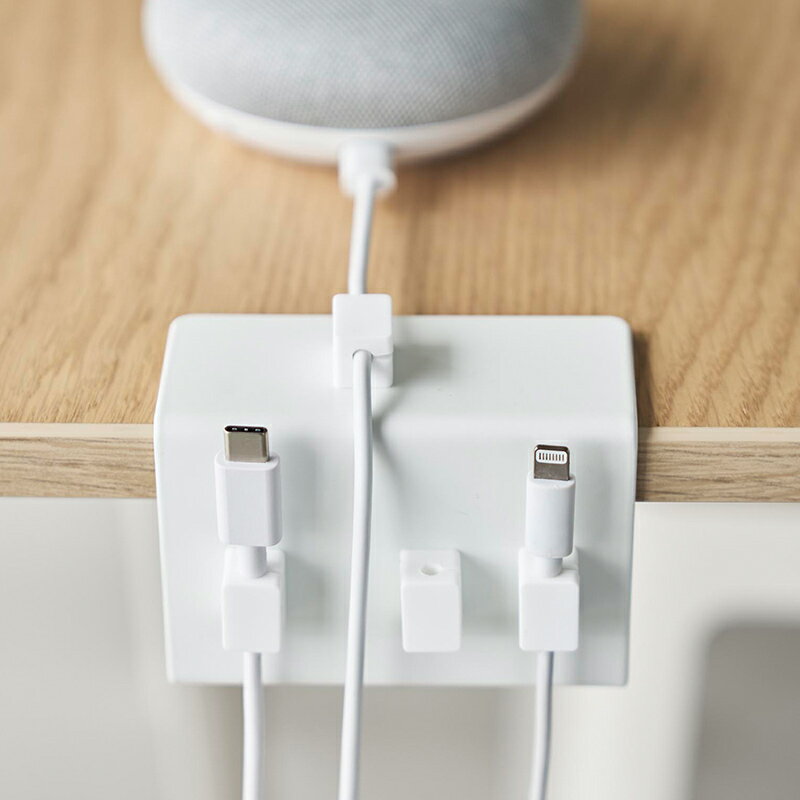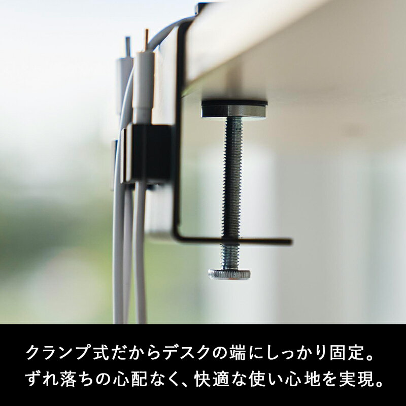 コード類を最大4本までまとめられるケーブルホルダー。 クランプで固定した本体にマグネットで貼るだけで自分好みにカスタマイズすることができます。 パソコンデスクやリビングなど様々な場所で活躍できるアイテムです。 ●北海道・沖縄・離島は追加送料がかかります。注文確認後、送料修正しご案内いたします。 この商品はラッピング可能です。(+110円)ご希望の方は[ラッピングする]を選択のうえ、ご注文ください。 JAN:4903208103732smart デスク横ケーブルホルダースマート デスクの側面にしっかり固定できるクランプ式のケーブルホルダー。 付属のマグネット式ホルダー4個で、充電ケーブルをすっきり整理できます。スマホの充電やPC作業時にケーブルが絡まず、手元を快適に保ちながらデスク周りを美しく整えます。 クランプ式だからデスクの端にしっかり取り付け可能。動いてずれたり落ちたりする心配がなく、安定した使い心地を実現します。設置も簡単で、作業スペースを広く保ちながら快適に使えます。 ※設置場所の構造や材質、形状によっては取り付けできない場合があります。 マグネット内蔵のケーブルホルダー4個付きで、充電コードやイヤホンケーブルをすっきりまとめられます。必要な時にサッと手に取れる快適さで、デスクの煩雑さを解消します。 コード類をまとめることで見た目もすっきり。デスク上の乱雑さを防ぎ、作業効率がアップします。シンプルなデザインでインテリアにも自然に溶け込む、洗練された印象に。 ケーブルをまとめて整理整頓 テープで貼り付けるマグネットケーブルホルダー スマート 5連 フィルムフックシリコーン歯ブラシホルダー タワー 5連 マグネット ケーブル&ルーター収納ラック スマート ⇒ 商品カテゴリー>デスク周り ⇒ マグネットを利用したtowerの収納アイテム [ NEW ]大人気のtowerなど山崎実業の最新アイテムはこちら ●商品の詳細● 品 名 smart デスク横ケーブルホルダー スマート サイズ 本体:約 幅9 × 奥行き4.5 × 高さ7.3~12.2cm ケーブルホルダー1つあたり:約 幅1.1 × 奥行き1.1 × 高さ1.6cm (ケーブルホルダー内径:約4mm) 耐荷重 約 450g(静止荷重)(ケーブルホルダー1つあたり:約 75g) 材 質 本体:スチール(粉体塗装)クッション:シリコーンゴムケーブルホルダー:シリコーンゴム、ネオジムマグネット 重 量 約 260g カラー ホワイト/ブラック 付属品 六角レンチ 入 数 1個 備 考 <取り付け可能な場所> 天板の厚さが1.2~5.5cm(幕板やパイプ等含む)、幅9cm以上(脚含まず)、奥行き4.2cm以上の平らなデスク等 ■注意点 ※サイズや形状、幕板やパイプの位置によっては取り付けできない場合があります。 ※不安定な場所を避け、平らな場所に設置してください。 ※設置後は、製品がしっかり固定され安定しているか、必ずご確認の上ご使用ください。 ※耐荷重制限は必ずお守りください。耐荷重制限内でも、大きな衝撃により製品が落下し、ケガや破損の原因となることがありますのでご注意ください。 ※耐荷重は、設置場所の材質・強度・状態・環境等によって異なります。設置するデスク等の耐荷重や強度を必ず確認の上ご使用ください。 ※ケーブルを収納する際は、安定して設置できるかあらかじめご確認ください。また、重量が偏らないようバランスよく収納してください。 ※ケーブルホルダーはケーブルを保護するものではありません。また、ケーブルのサイズや形状によっては挟み込めない場合があります。 ※収納する電子機器や周辺機器等の取扱説明書をよく読んでご使用ください。 ※直射日光の当たる場所や、火の近く、高温になる場所では使用しないでください。 ※商品の色は、画像と実物とでは多少異なる場合がございます。色・イメージが違う等の理由による返品は一切お受けできません。予めご了承下さい。