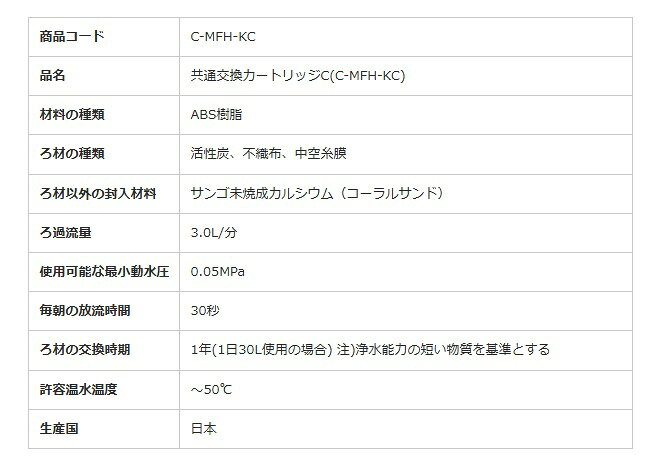 アクアセンチュリー2、アクアセンチュリー2ホワイト用の交換カートリッジです。 水の美味しさの源であるミネラル分はきちんと残したうえで、トリハロメタンや農薬など、 JIS規格に定められた17項目の物質に加え、鉄(微粒子)、アルミニウム(中性)、 有機フッ素化合物(PFOA及びPFES)も除去します。 カートリッジ交換の目安は、1日30リットル使用して1年に1回です。 飲み水だけでなく、野菜洗いや、お米のとぎ水などにもたっぷりと使用できます。 ※お客様の使用量に関わらず衛生上の観点からカートリッジ交換は定期的にお願いします。 交換時期を経過したカートリッジは十分な性能が得られない場合があります。 【対応商品】アクアセンチュリー2(MFH-112N、MFH-112)、アクアセンチュリー2ホワイト(MFH-113) 【ろ材の交換時期】1年(1日30L使用の場合) 注)浄水能力の短い物質を基準とする ■画像はイメージです。また、商品の色は画面の見え方等により、実物とは異なる場合があります。 ■こちらの商品は、メーカー取り寄せとなります。メーカー欠品・完売時は、 ご注文のキャンセルをお願いさせていただくこともございますので、ご了承のほどよろしくお願いします。 ■商品の仕様やメーカー保証内容等、詳細につきましては、メーカーホームページや、 メーカーカタログ等で必ずご確認の上、ご注文をお願いします。 ■商品発送後のキャンセルは承っておりません。また、お客様のご都合によるキャンセルも承っておりません。 ■ご注文前に、当店のパソコンサイト上の「ご注文前に要チェック!」で注意事項を必ずご確認ください。 詳しくは、メーカーホームページ等をご覧ください。 または、ゼンケン:0120-135-232 までお問い合わせ下さい。こちらの商品は、メーカーからのお取り寄せとなります。 そのため、納品まで少々お時間をいただきます。 また、メーカー欠品・完売時は、ご注文のキャンセルをお願いさせていただくこともございます。 あらかじめご了承のうえでご注文いただけますよう、お願いいたします。 ご注文に際しご確認いただく事項をご案内させていただいております。 ご注文前にかならずご確認いただけますよう、よろしくお願いいたします。