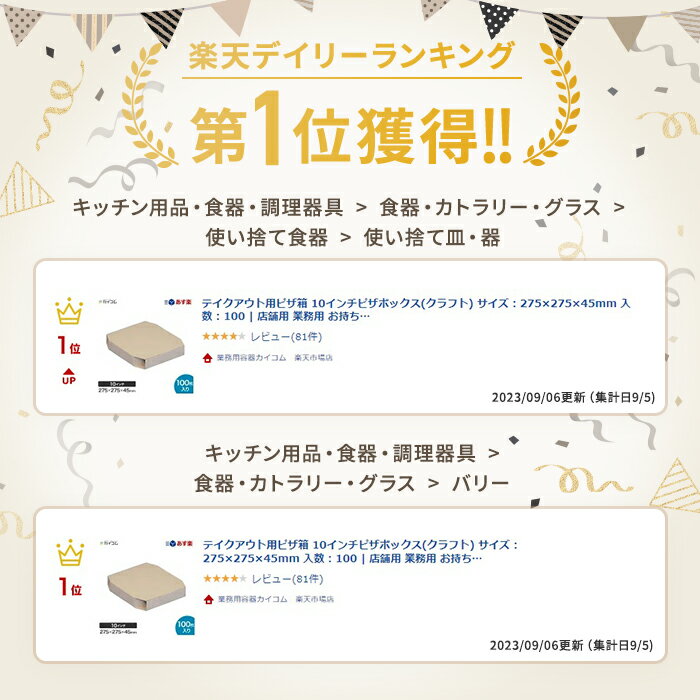 商品コード : 187833規格 : 275×275×45mm入数 : 100   外面はクラフトですが、内側は白色の食品衛生紙を使用しております。ピザ箱は10インチのサイズで直径約25cmのピザに最適な商品です。ピザボックスシリーズはピザの大きさに合わせて8インチ、10インチ、12インチ、14インチの4タイプご用意がございます。オシャレなクラフトタイプでミニダン素材でできておりイタリアンのお店やピザ店から長くご利用頂けている商品です。取っ手がついていない分2枚以上重ねて入れる事が出来ます。テイクアウト用のピザ袋もご一緒にどうぞテイクアウトピザ袋・無地バンバン No.3ピザのテイクアウトをお考えの飲食店様にカイコムが自信を持っておすすめできる商品でございます。ピザの容器を楽天市場でお探しなら!安い商品の取扱いがあるカイコムへ!ピザ箱 ピザの箱 ピザケース ピザボックス ピザBOX ピザ 箱 食品容器 食品包材 業務用 使い捨て 使い切り おしゃれ ナチュラル テイクアウト 持ち帰り 宅配 デリバリー 出前 イタリアンレストラン ピザ屋 飲食店 店舗用ピザ袋対応表 ※ピザ箱が入る枚数の目安です。 無地バンバンNo.1無地バンバンNo.2無地バンバンNo.3無地バンバンNo.4無地バンバンNo.58インチピザボックス2枚3枚---10インチピザボックス-2枚3枚--12インチピザボックス--1枚2枚3枚14インチピザボックス---1枚2枚