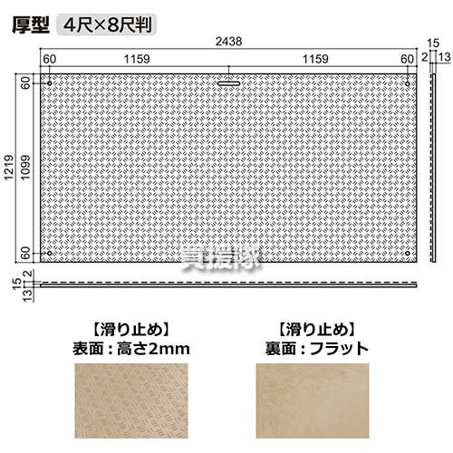 納期について:メーカー直送品(代引き不可) 【ウッドプラスチック 敷鉄板より軽量 運搬 施工 簡単 農業 農場 田んぼ 畑 畦道 道路 路上 地面 板 ボード 敷設 養生敷板】 ●農業分野専用の養生敷板 ●頑丈で軽量、低価格 ●安心の国内生産(ISO9001 取得) ●プラスチック(ポリエチレン)を木質繊維により強化した複合材料『ウッドプラスチック』を使用 仕様 メーカー WPT 品名 養生用 敷板 厚型 1219×2438mm 10枚セット Diban ディバン 表面滑り止め付き 品番 DB4815 カラー ベージュ ディバン 厚型4尺×8尺判 サイズ (幅)1219mm×(長さ)2438mm 厚さ 総厚15mm(板厚13mm+滑り止め表面2mm) 重量 39kg(±5%) 滑り止め 片面滑り止めタイプ 表面 滑り止め表面[高さ2mm]、裏面[フラット] 入数 10枚 ●ご利用上のご注意 設置・撤去・移動時等、人の手で取り扱う際は、必ず作業用手袋を着用して下さい。 軽量の為、車両の走行によりズレが生じる場合があります。 台風などの突風で飛ばされる場合があります。荒天が予想される場合は固定もしくは撤去して下さい。 樹脂製品の為、季節による急激な気温変化により反りや収縮が発生する事がございます。 鉄製クローラー車両の走行は破損のおそれや摩耗が早まります。 砕石、コンクリートガラ等、敷板に鋭利な物が刺さる条件では破損のおそれがあります。 敷板を固定した状態での持ち上げや、敷板上に物を載せた状態での移動は破損のおそれがあります。 敷板の固定を解除、または敷板上から物を降ろして移動させて下さい。 ●禁止事項 側溝や段差など敷板の下に空間がある条件での使用。 クレーンのアウトリガー用敷板としての使用。 軟弱地盤や崩落の恐れがある地盤での使用。 製品上でのたき火、溶接火花等による火気使用。 ※こちらの商品は北海道・沖縄・離島は別途送料お見積もりとなります。ご購入前にご連絡をお願い致します。