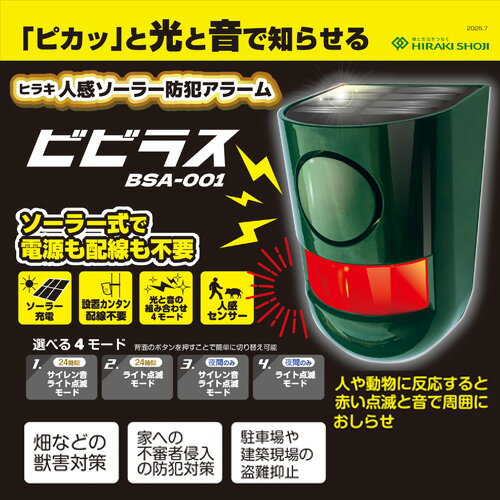 【最大9600円OFFクーポン発行中】【P3倍】ヒラキ 人感ソーラー防犯アラーム ビビラス BSA-001【60個セット】【防犯 侵入者 覗き 泥棒 ストーカー 対策 人感センサー 感知 不在時 防犯アラーム ブザー ライト 点滅 音 威嚇 家 自宅 店舗 会社 施設 ビニールハウス 農作物 田