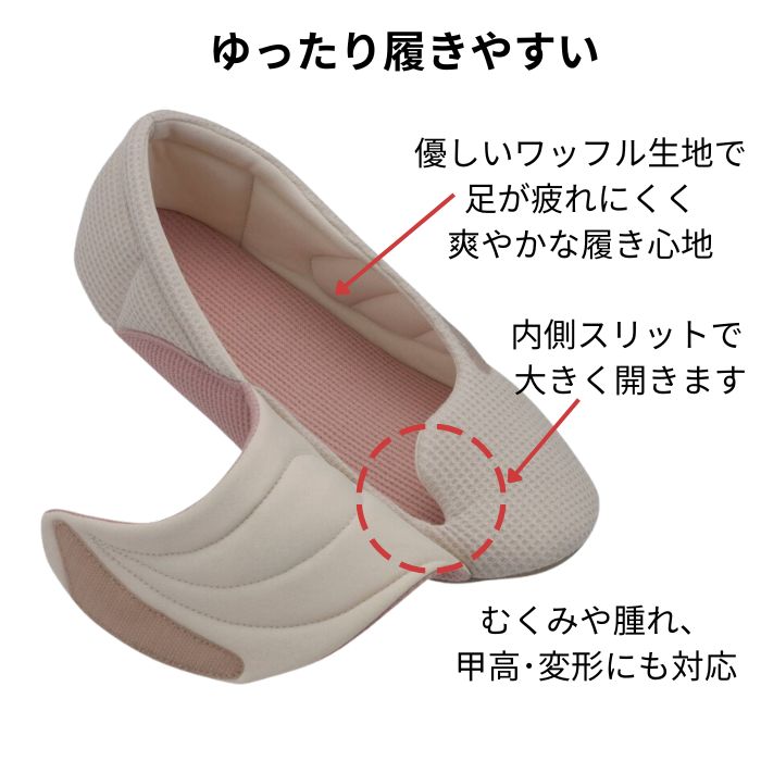 製品仕様 商品名 徳武産業 あゆみ ワイドベルトワッフル(2229) 生産国 中国製 内容量 1足(両足販売) お手入れ方法 手洗い可能(中性洗剤、保形後陰干) 素材/材質 ○表素材:綿60%、ポリエステル40% ○内素材:ポリエステル100% ○底材:合成皮革 商品説明 ○室内用 お家の中でも安心のルームシューズ。足元をおしゃれに包む。 1.足にフィットする 2.ほどよいすべり止め 3.ソフトでやさしい履き心地 4.手洗い可能(中性洗剤、保形後陰干) ○むくみや腫れがある時でも、お洒落にゆったりと ○内側スリットで大きく開き足入れがスムーズ さらにむくみや変形に対応 ○足の状態に合わせて、幅広ベルトで簡単調整 履かせやすく、脱がせやすい ○中底に衝撃吸収素材(ピタフォーム)を採用 足が疲れにくい ○合皮の底で水がしみ込みにくい ほどよい滑り止めで歩行をサポート サイズ Mサイズ:22.0~23.0cmLサイズ:23.5~24.5cmLLサイズ:25.0~26.0cm3Lサイズ:26.5~27.5cm ※ピンクはLLまで足囲:9E相当重さ:70g (片足Lサイズ) 注意事項 ※画面上と実物では多少色具合が異なって見える場合もございます。ご了承ください。 ※ご注文受付後、通常1〜2営業日で発送いたします。 ※複数店で在庫を共有しているため、ご注文のタイミングで在庫が確保できない場合がございます。 メーカー 徳武産業株式会社(香川県さぬき市大川町富田西3007番地) Mサイズ Lサイズ LLサイズ 3Lサイズ 足長 22.0〜23.0 23.5〜24.5 25.0〜26.0 26.5〜27.5 足囲(足幅) 26.7(9.4) 27.4(9.7) 28.1(10.0) 28.8(10.3) この商品は「ゆったりめ」に作られています(9E相当) ぴったりサイズで履く場合はワンサイズ下をお求めください